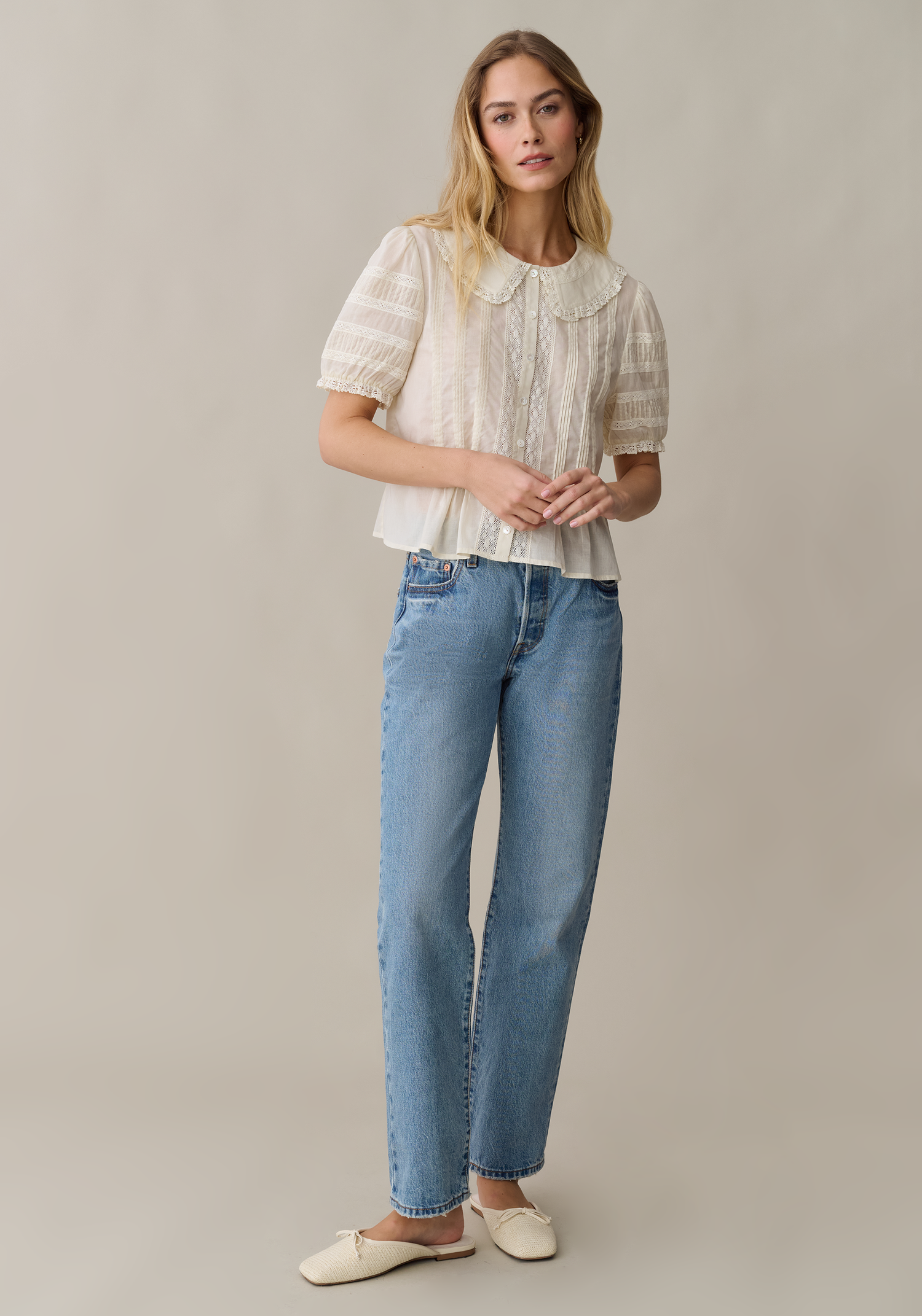 Featuring a charming oversized collar with delicate lace trim, this top offers a nostalgic yet polished take on classic shirting. The intricate combination of vertical pintucks and lace paneling creates a light, airy texture that pairs perfectly with casual denim or tailored separates.