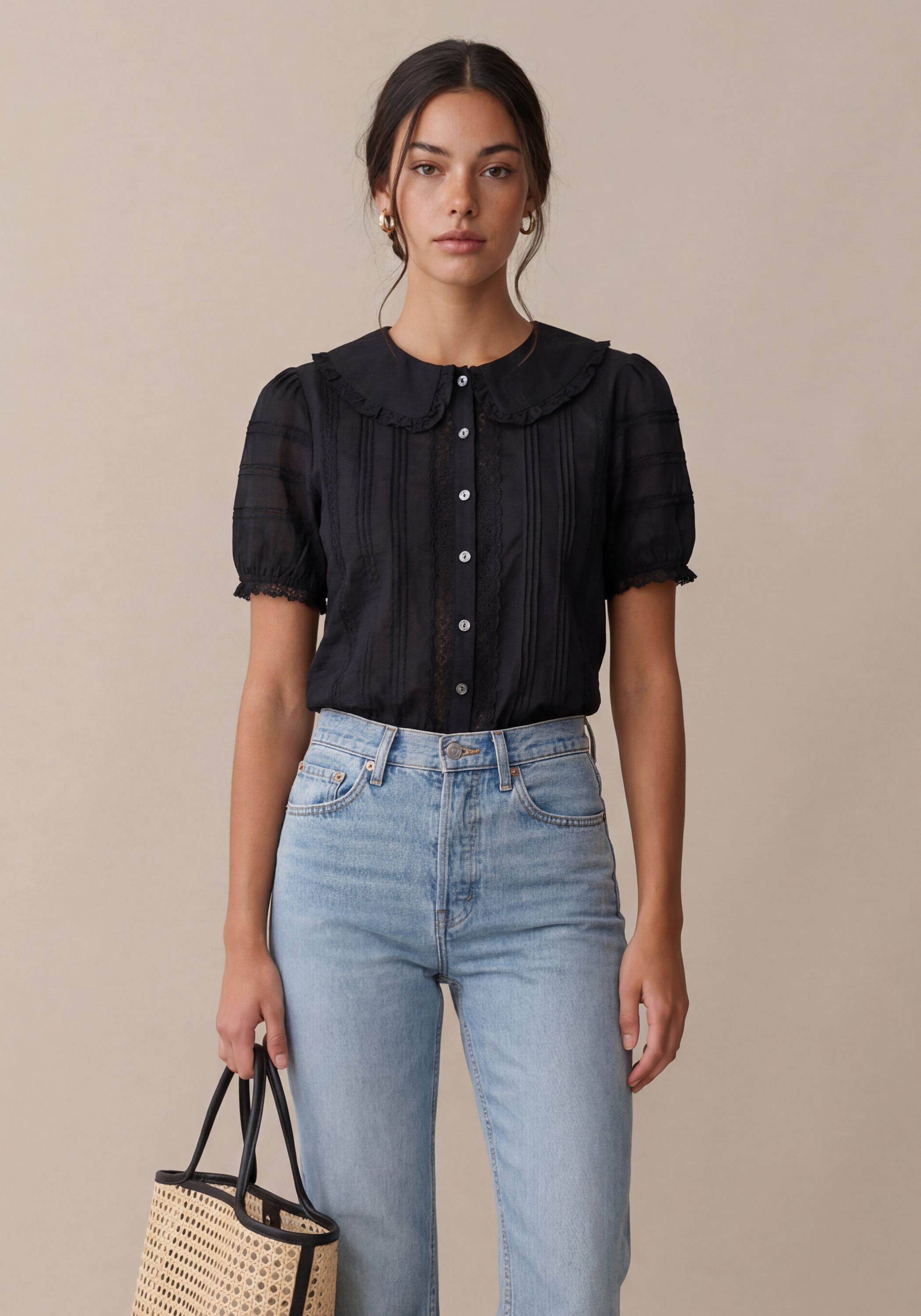 Featuring a charming oversized collar with delicate lace trim, this top offers a nostalgic yet polished take on classic shirting. The intricate combination of vertical pintucks and lace paneling creates a light, airy texture that pairs perfectly with casual denim or tailored separates.