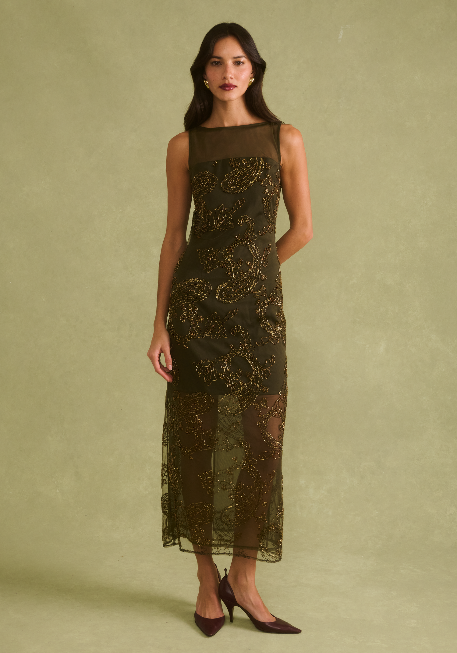 The Ora Dress features a rich olive green mesh with intricate gold beaded paisley embroidery. This refined piece combines elegant detailing with a versatile silhouette, perfect for evening occasions or elevated everyday styling.