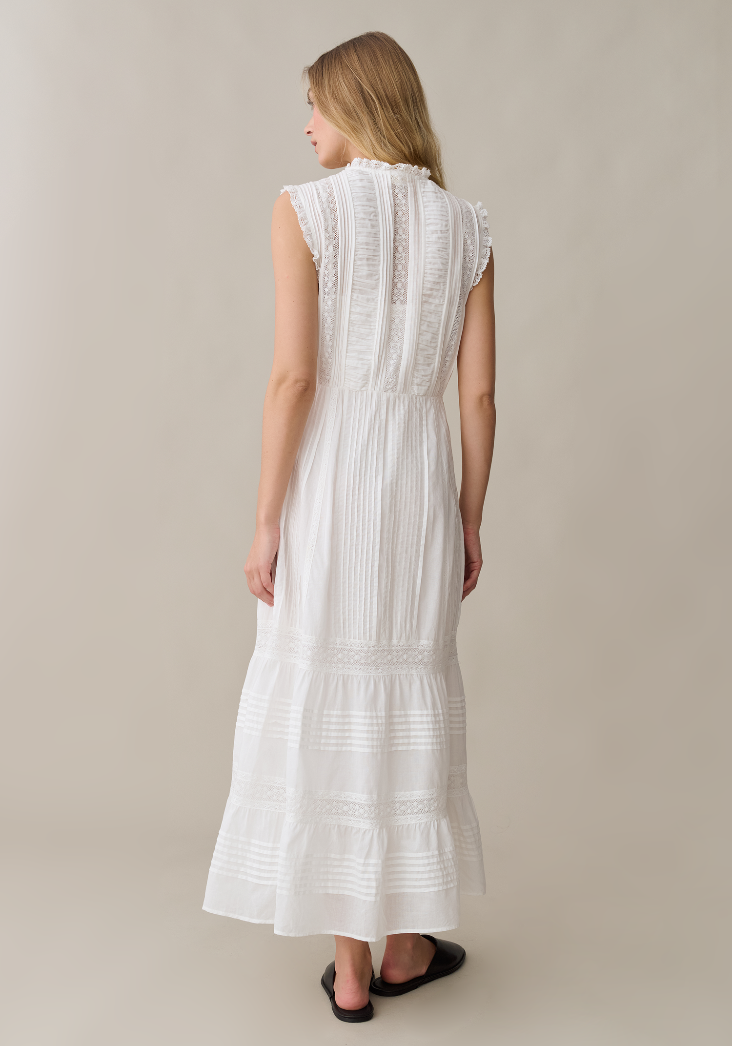 This dress is the perfect blend of vintage-inspired romance and modern, airy comfort. Featuring intricate pintucks, delicate lace panels, and a tiered maxi skirt, it’s a standout piece that feels completely effortless.