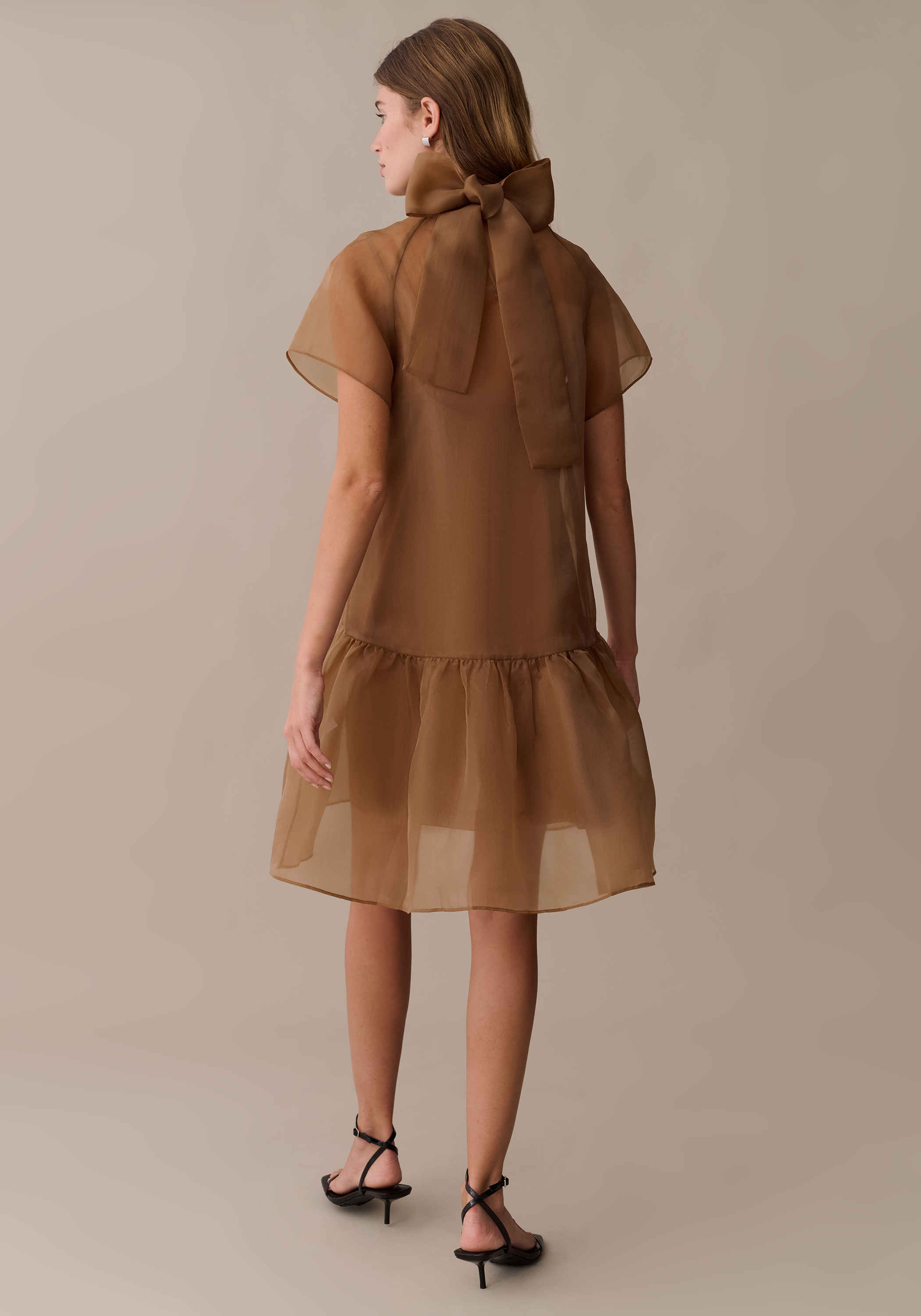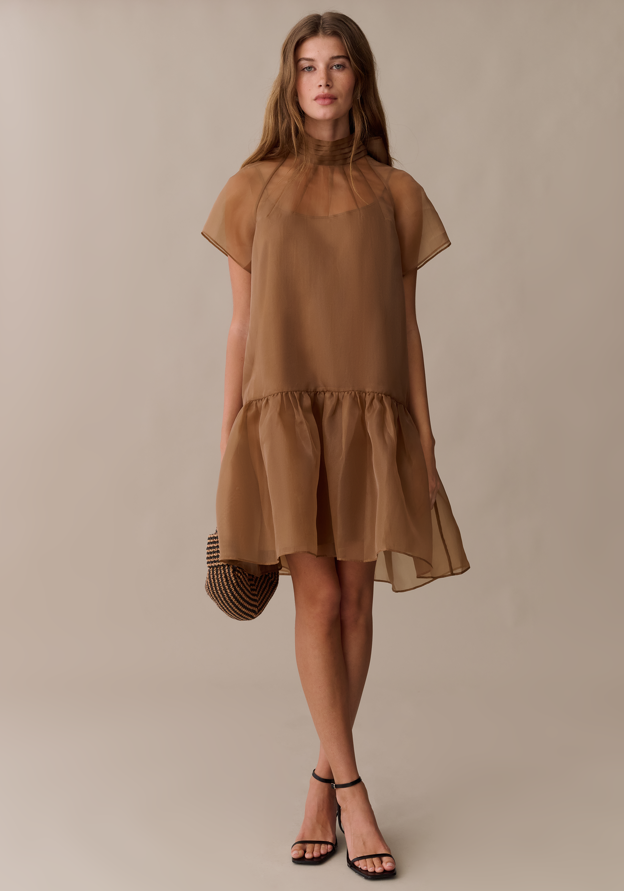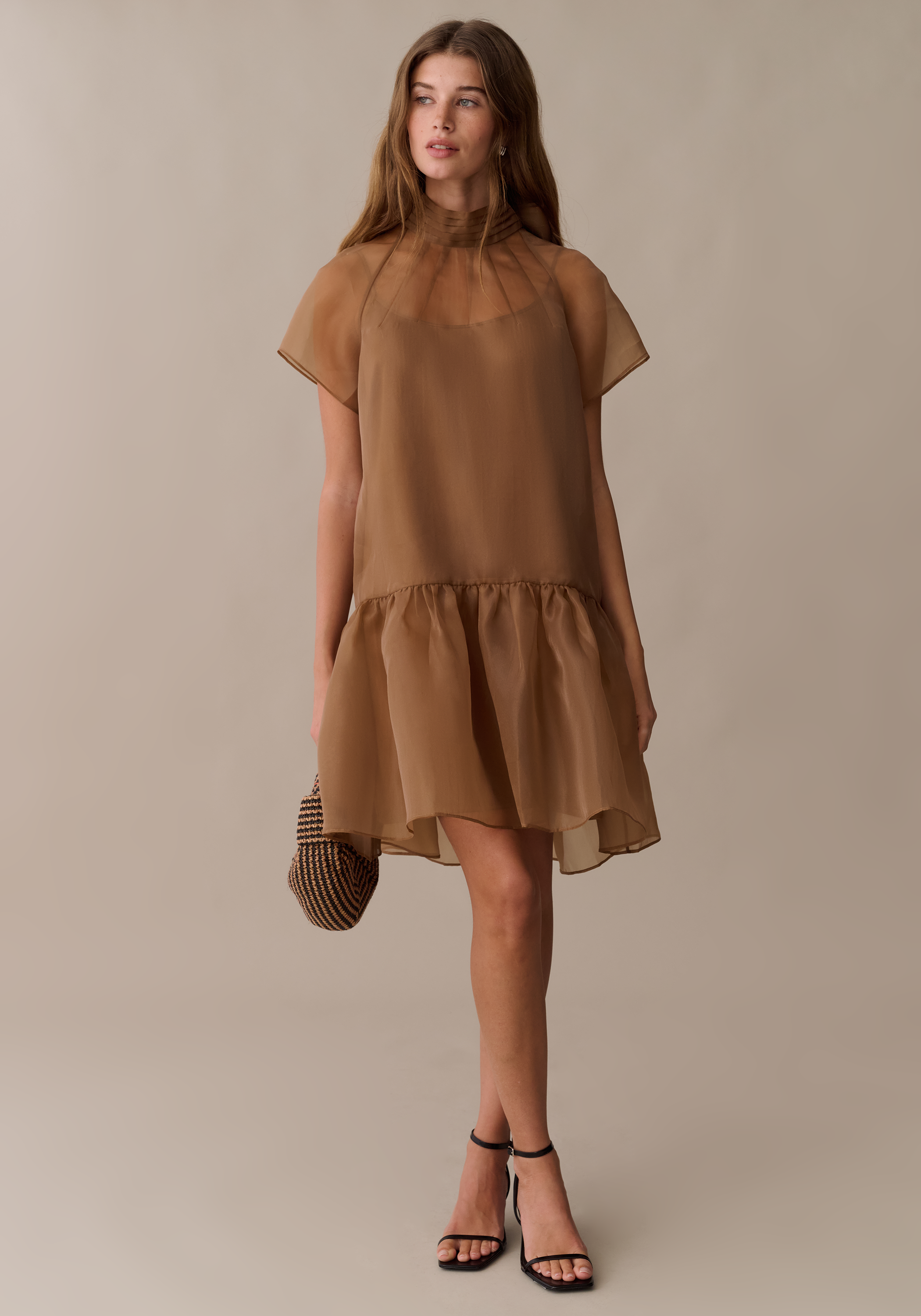 The Joni Mini Dress is crafted from fun, sheer organza that adds an airy elegance to this style. Its playful bow detail enhances the neckline, while the flouncy skirt creates movement and a flattering silhouette.