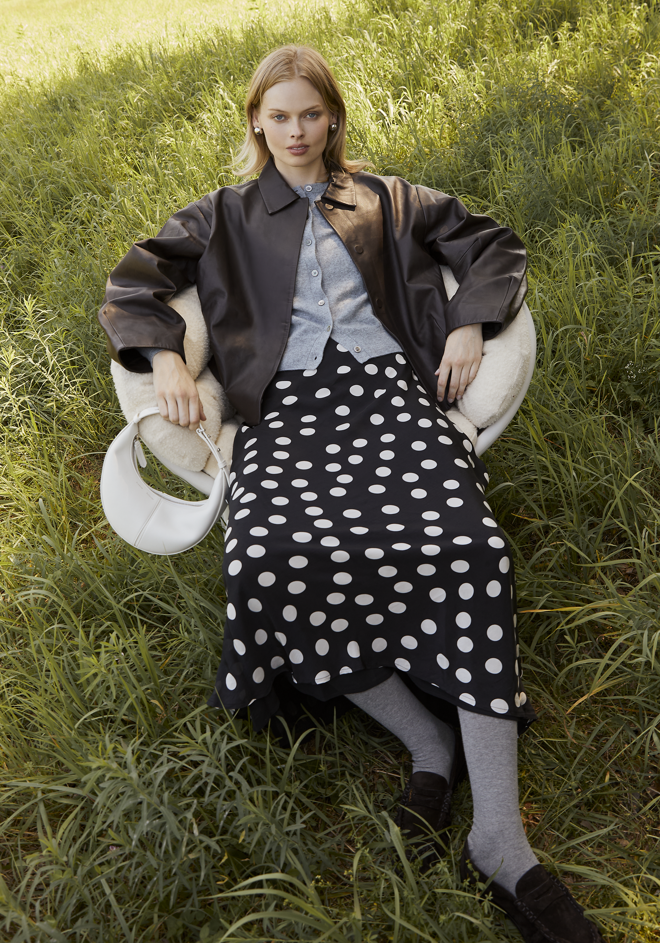 The Astoria Skirt features a chic maxi length and a playful polka dot print that adds a touch of fun to any outfit. Designed with a comfortable elastic waist, it offers ease of wear without compromising style. Perfect for those seeking a blend of elegance and everyday comfort.