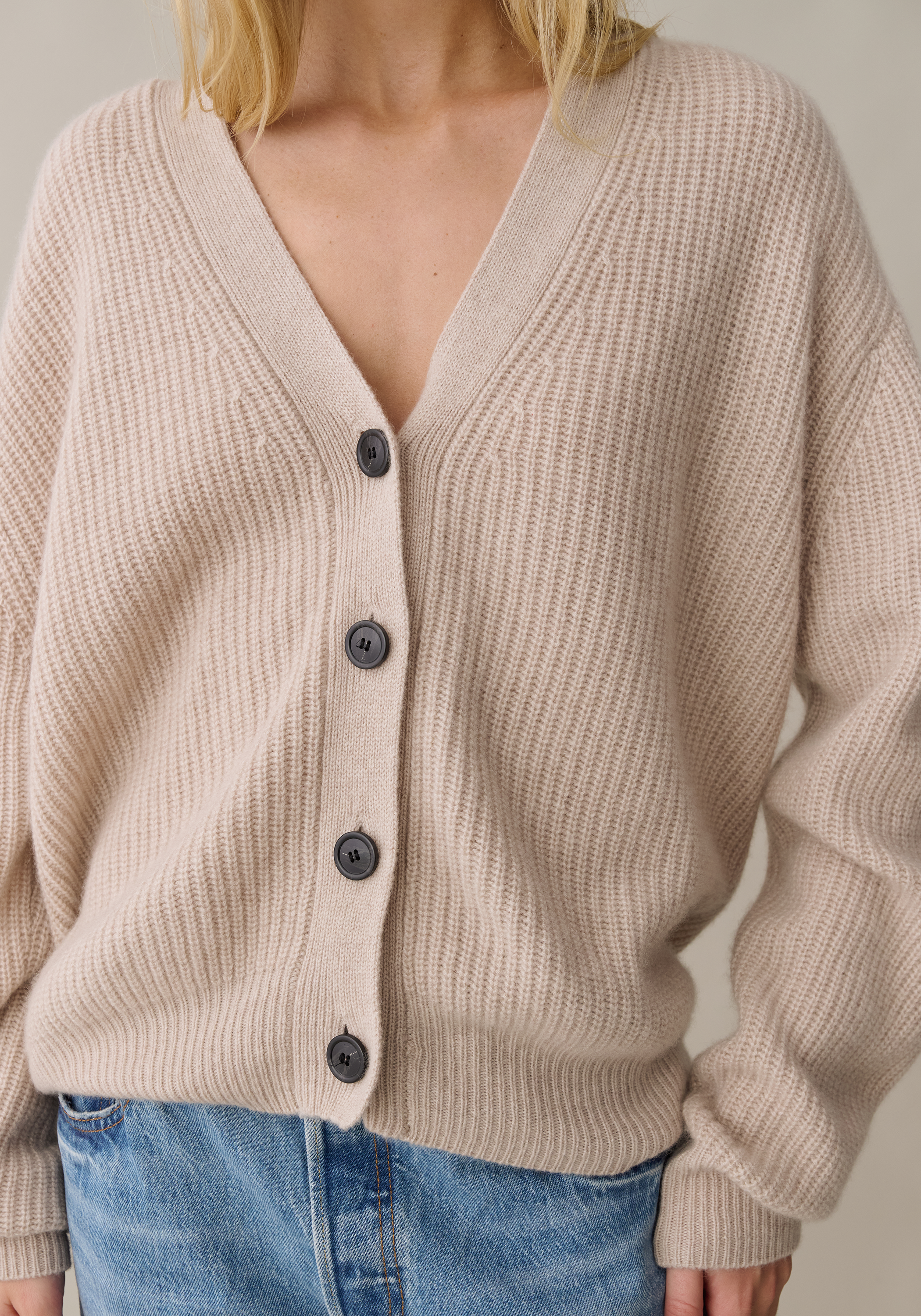 Introducing the Fia Cashmere Cardigan. This slouchy and button-up cardigan is crafted from a luxurious cashmere blend, making it super soft and cozy. Its versatile design allows for effortless styling options.