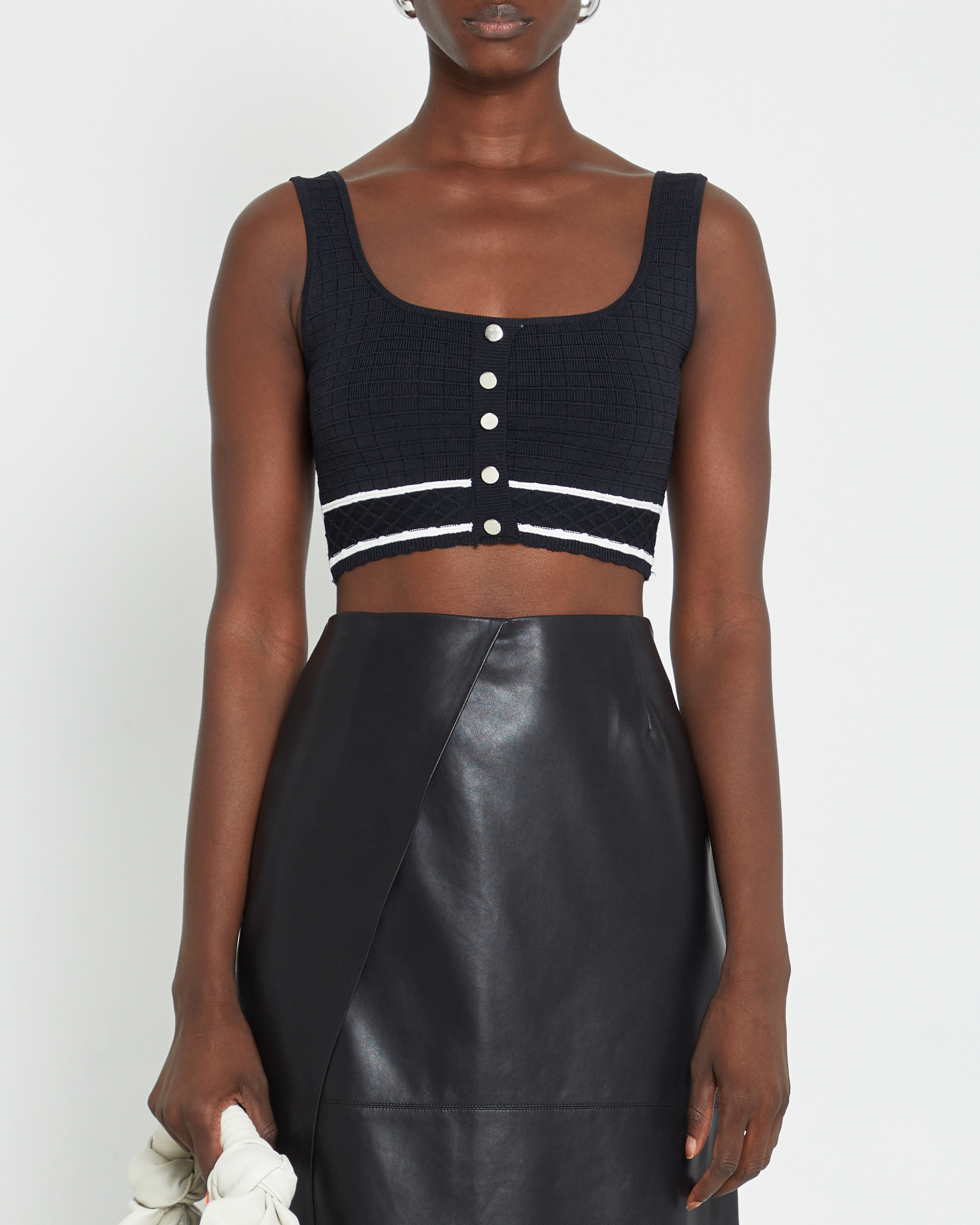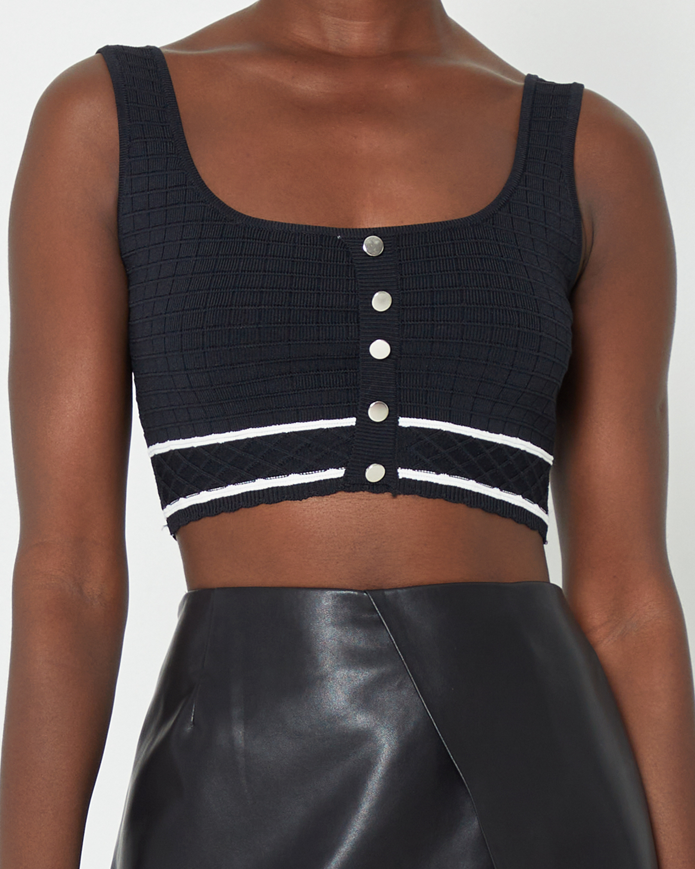 The Lea Cropped Top is a stylish choice for any ensemble. Its white trim and silver front buttons provide subtle sophistication to the adorable cropped design, while its snug fit will flatter your silhouette.