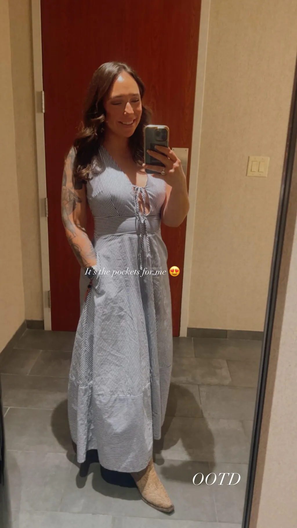 This Coralie Dress features a front tie detail and a plunging neckline, adding a dainty touch to this classic blue and white striped dress. Complete with pockets and a flowy skirt, this dress combines practicality with effortless style.