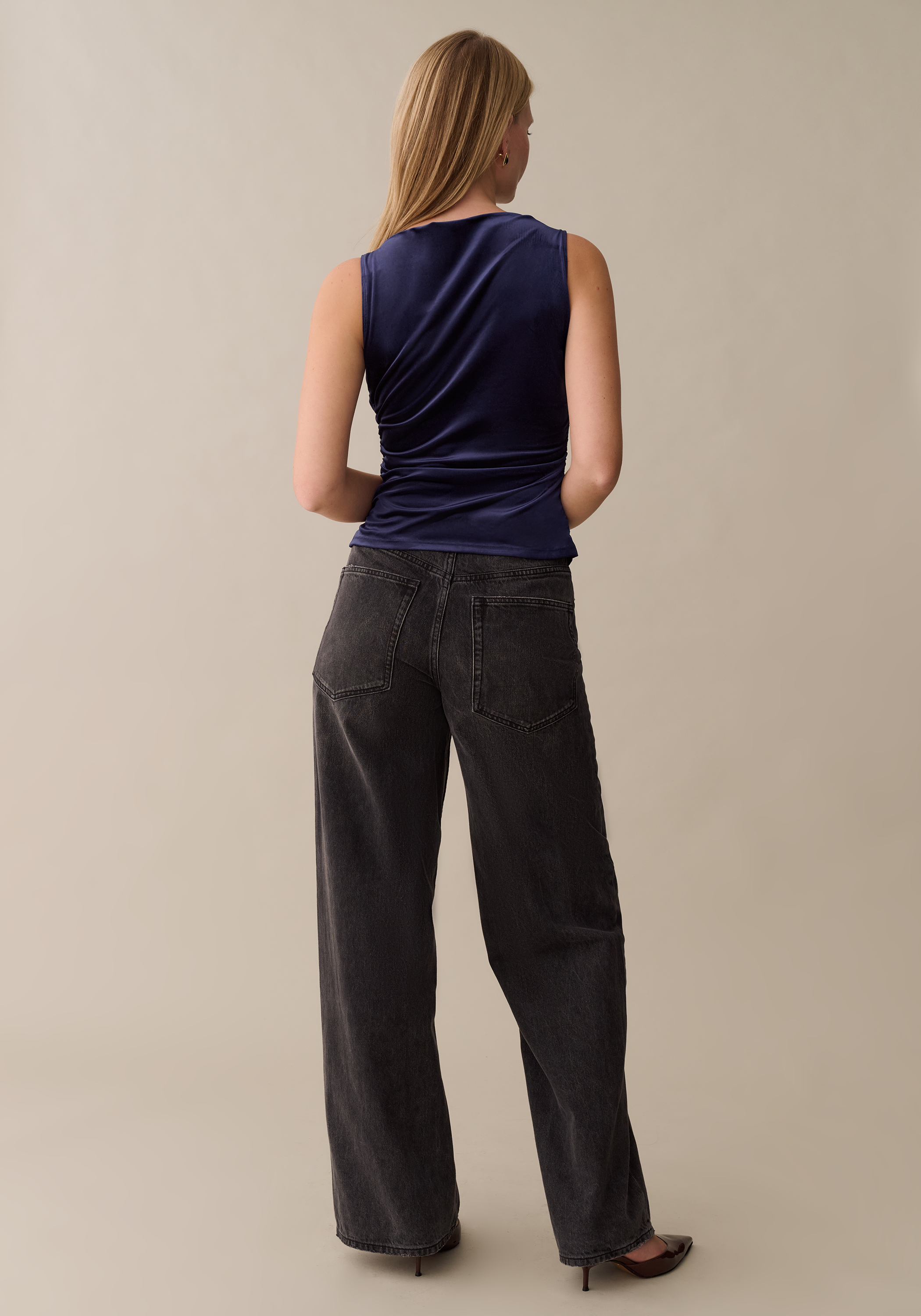 This sleeveless velvet top features a soft drape and a subtle sheen that enhances its sleek, minimalist silhouette. The high neckline adds a polished touch, while gentle ruching at the side creates a flattering fit. Effortlessly chic, it transitions seamlessly from day to night.