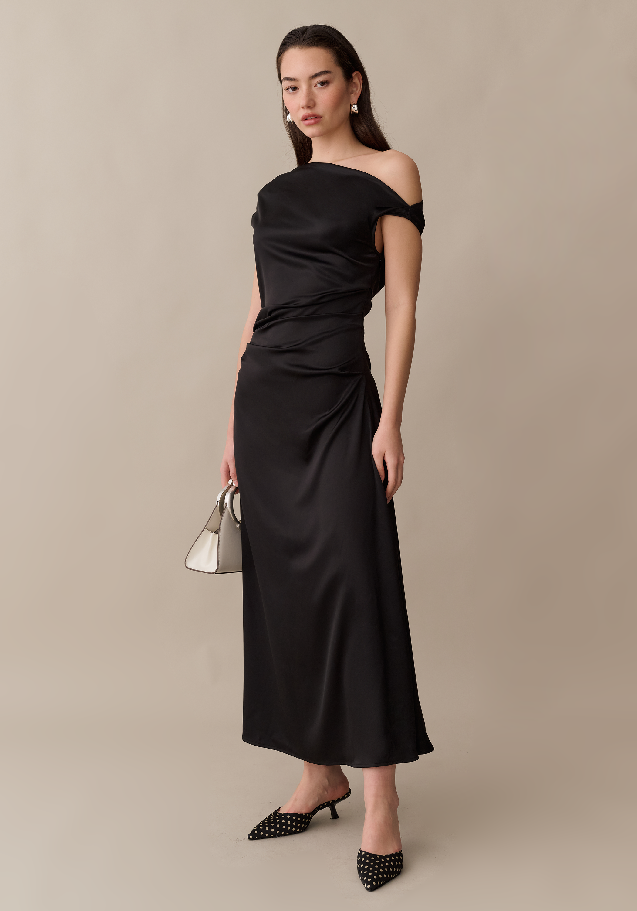 Elevate your evening look with the Ciela Dress, featuring a deep hue and silky fabric that drapes effortlessly. Its asymmetrical, off-the-shoulder design adds a touch of modern sophistication, while the fitted waist flatters your silhouette for an elegant finish.