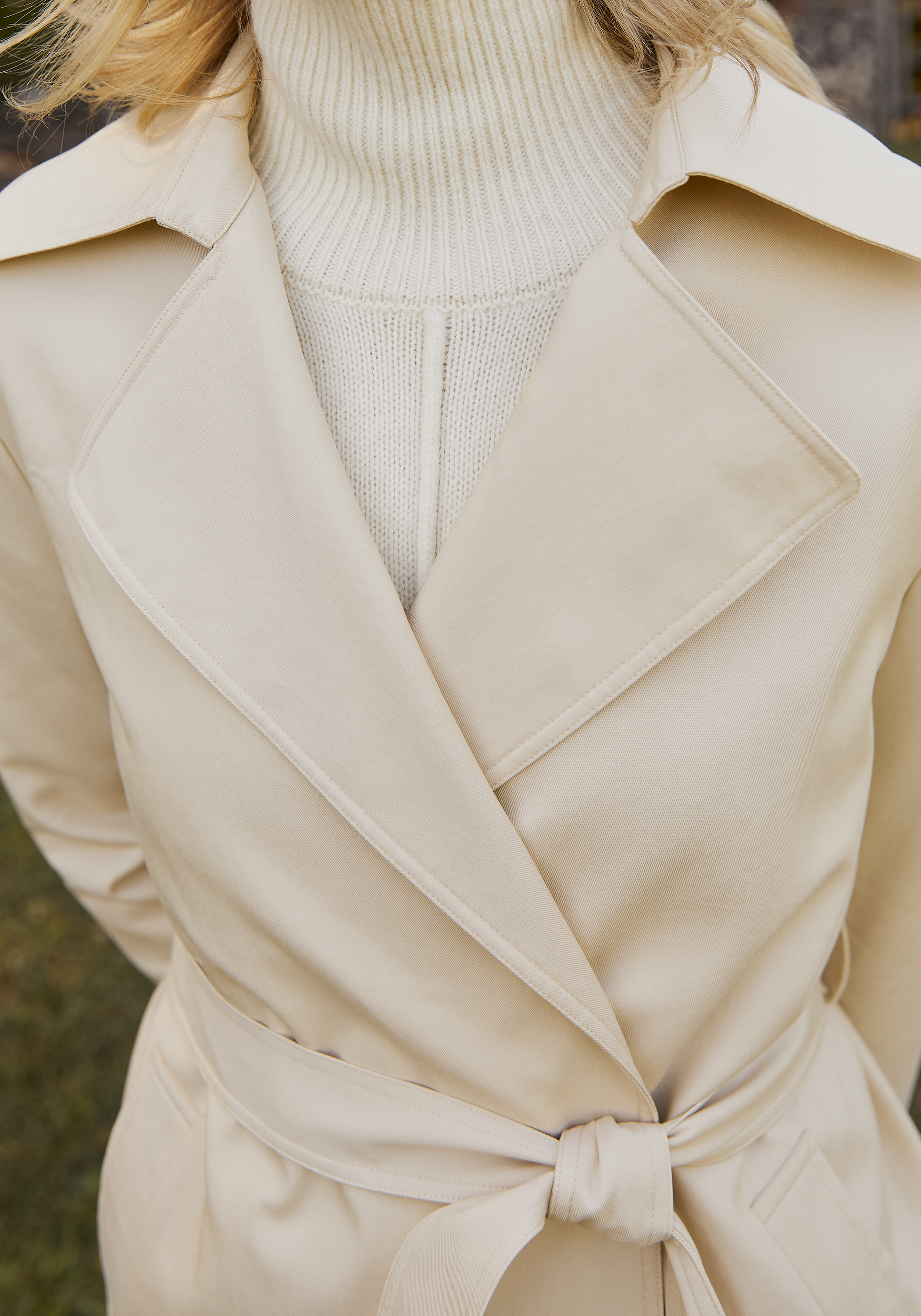 The clean and chic design of the Gale Trench Coat is highlighted by its simple, classic silhouette. The adjustable belt ensures a tailored fit, while the soft neutral hue adds versatility and understated elegance. Don't miss this timeless staple piece.