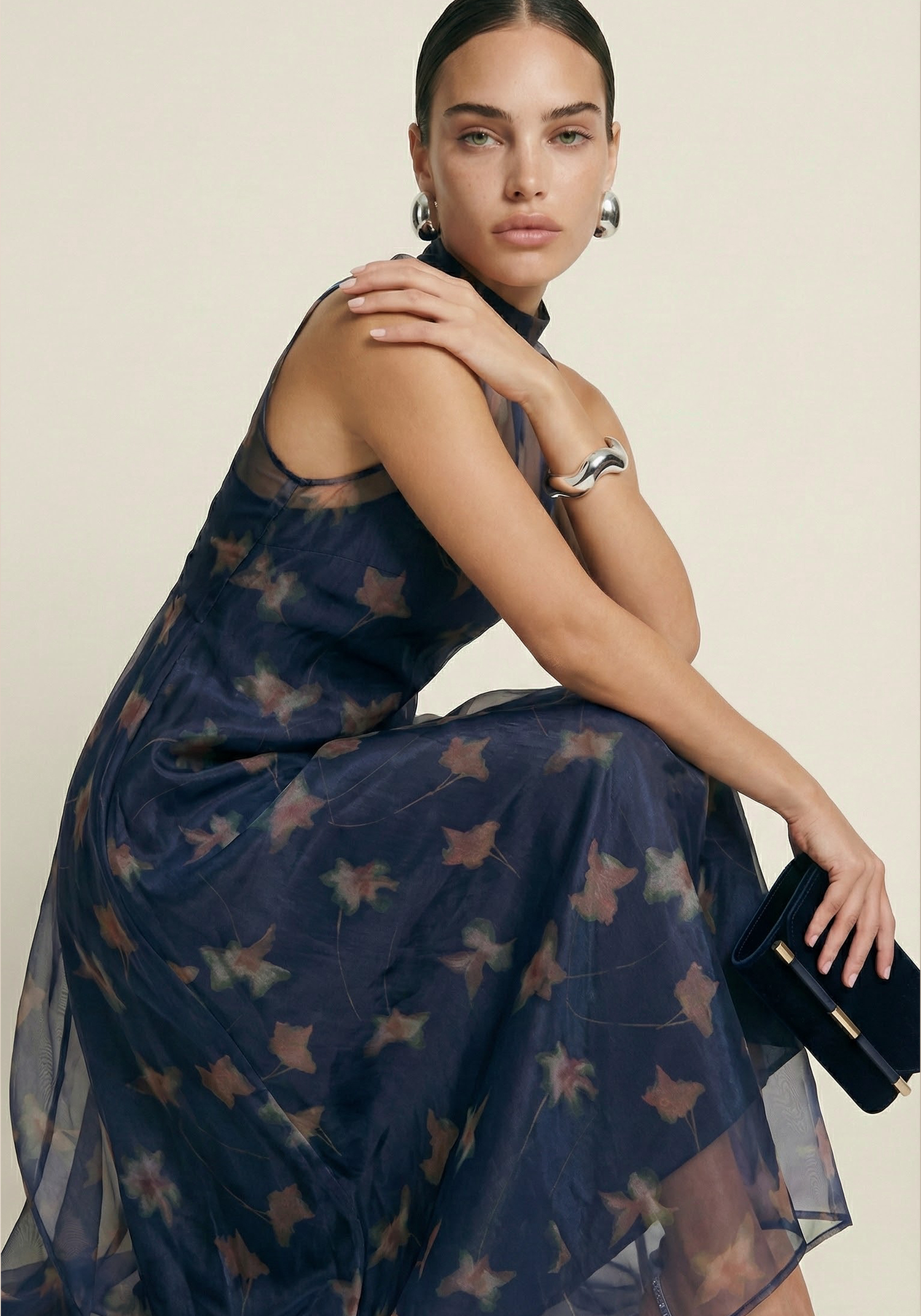 Expertly crafted, the Alette Dress features a stunning soft floral print on a chic navy backdrop. Made with floaty organza, this dress offers an elegant high neckline and a delicate back bow detail, making it the perfect choice for any occasion. Add a touch of sophistication to your wardrobe with this must-have piece.