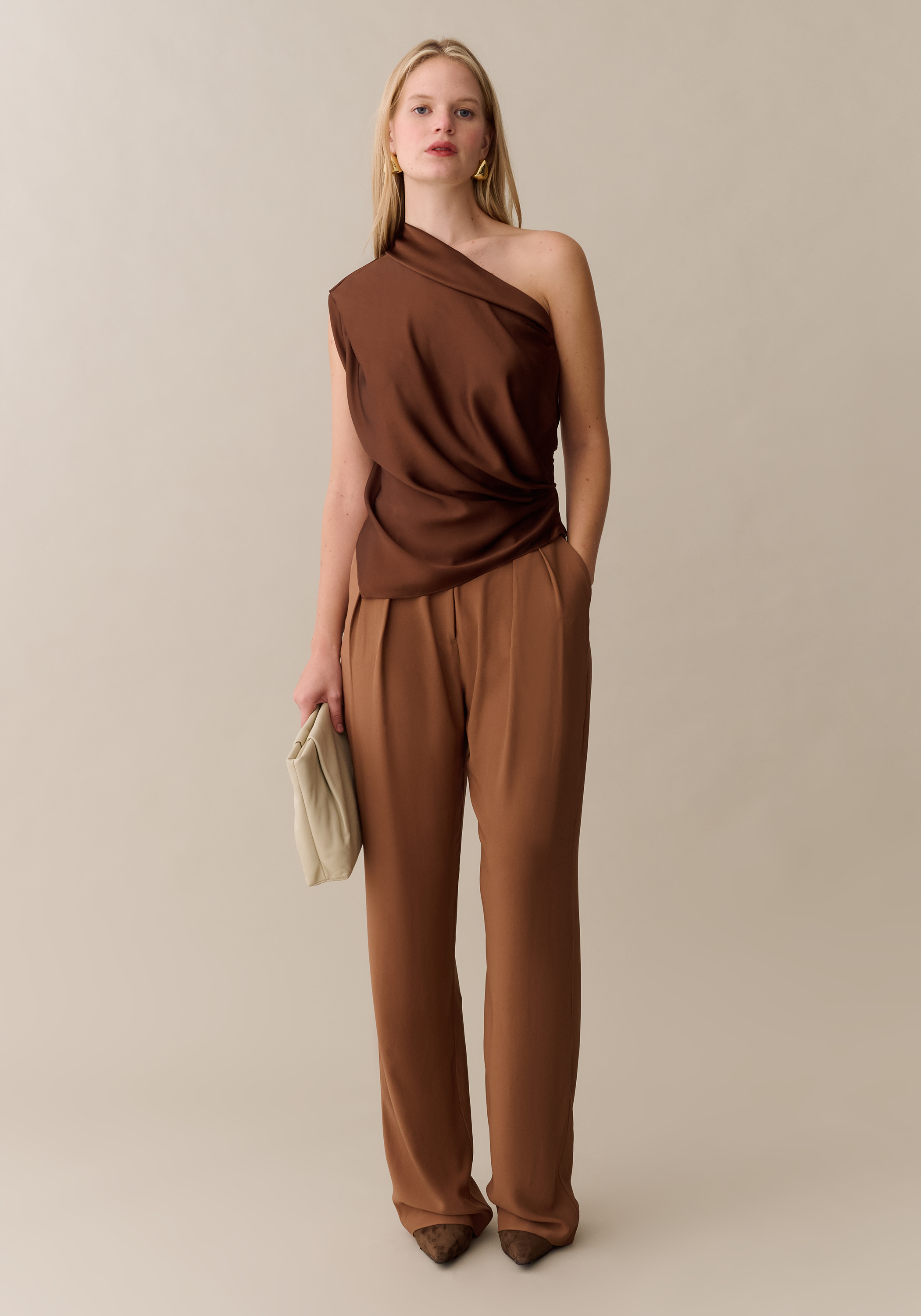Crafted from 100% silk, the Kiva Silk Top features an elevated one-shoulder design in a rich brown hue. Its lustrous shine and elegant folds create a sophisticated silhouette perfect for looking chic everyday.