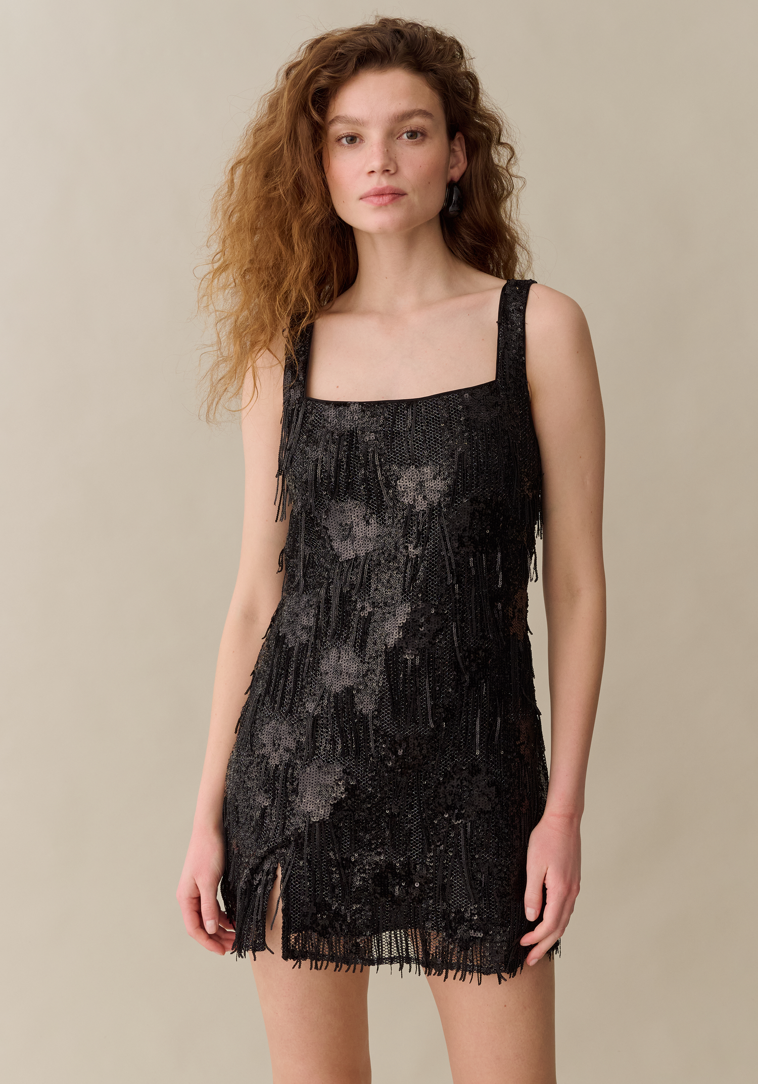 A cascade of beaded fringe and subtle sequin embroidery brings captivating texture and shine to this mini dress. The clean square neckline and streamlined silhouette offer balance, while the side slit adds a touch of movement and ease. Designed for dancing and memorable nights, it delivers high-impact glamour with modern poise.