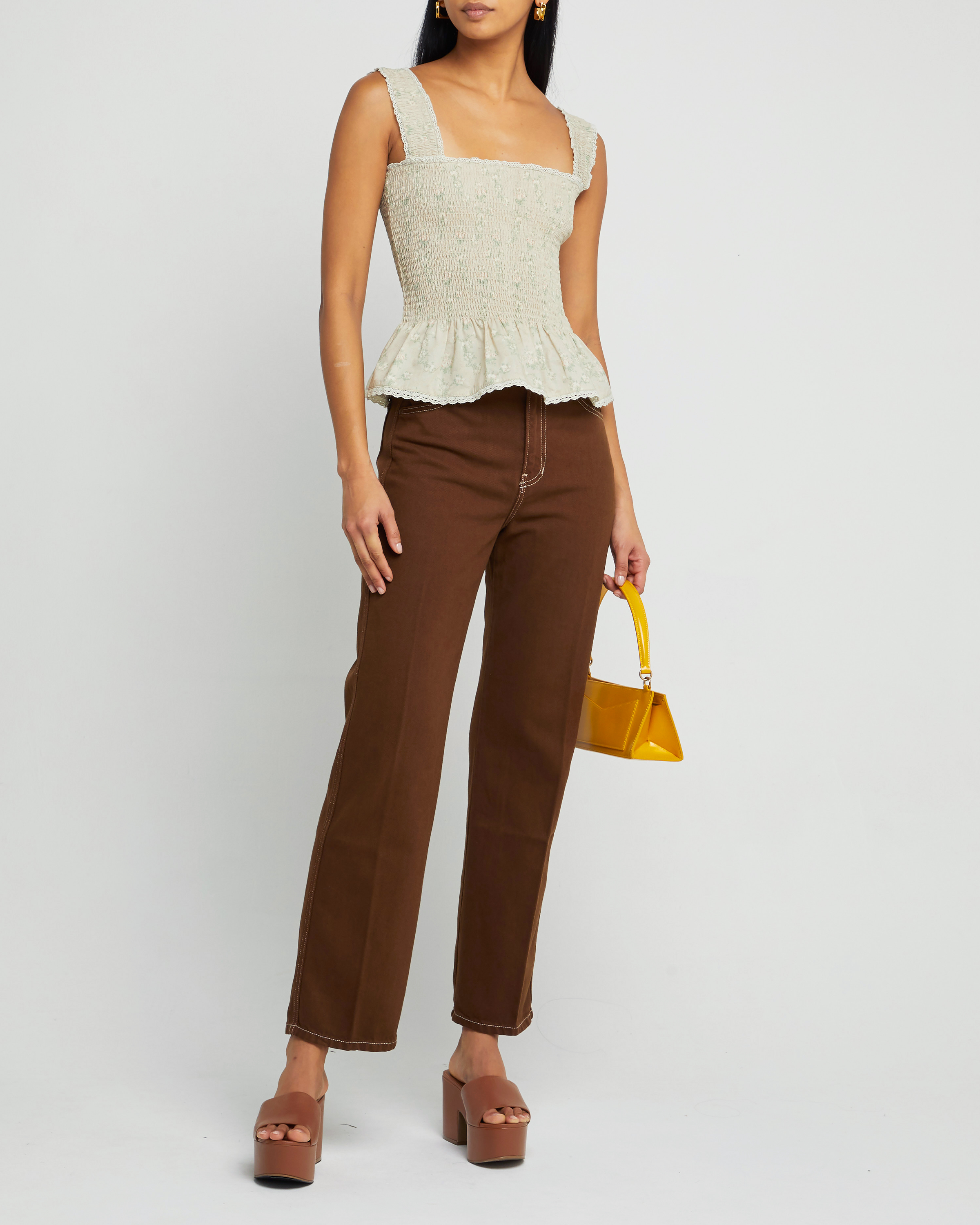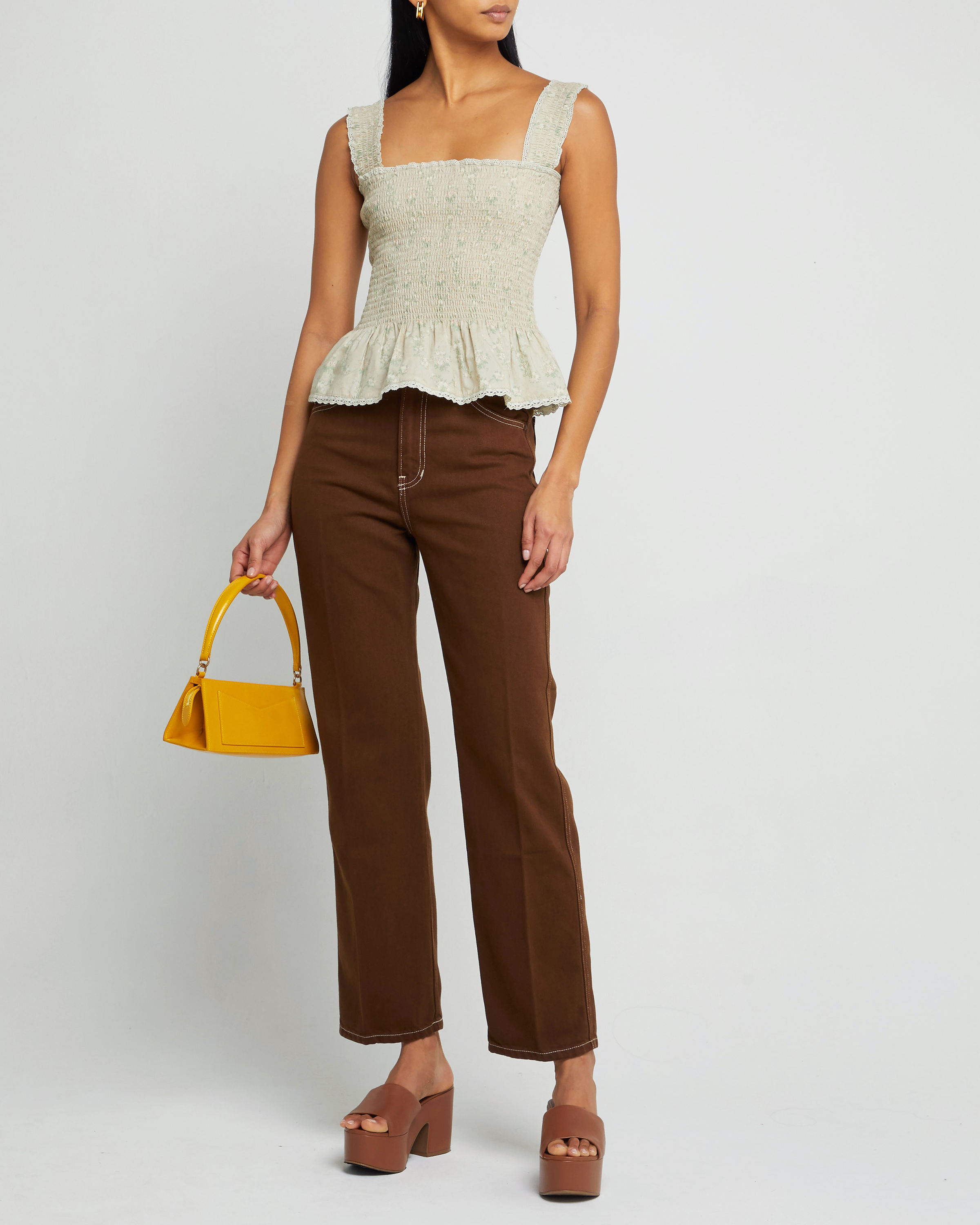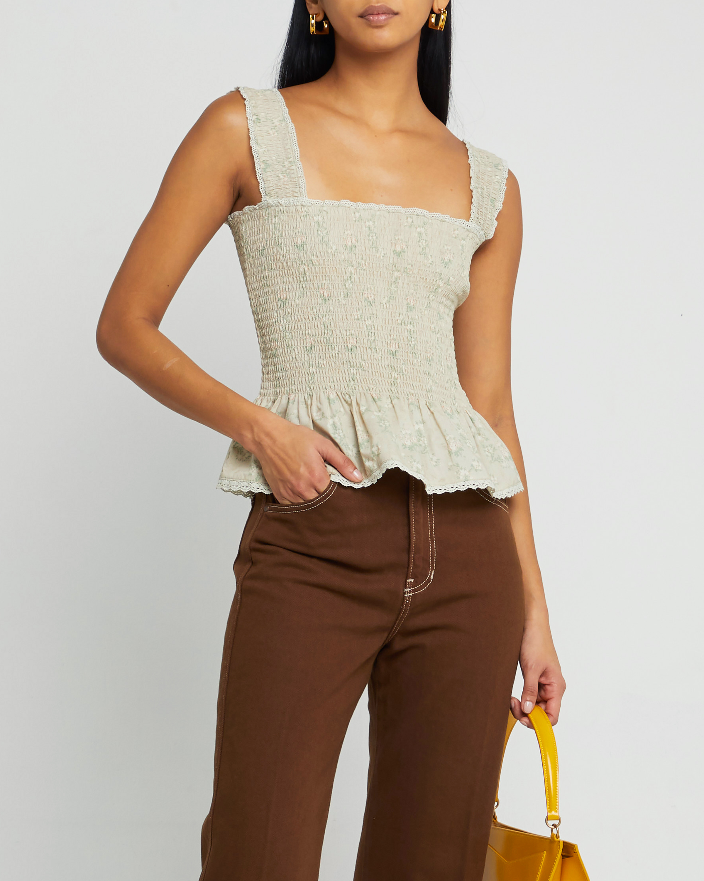 Cute and summery, this top features a smocked bodice with dainty lace trim. Done in a fresh 100% cotton.