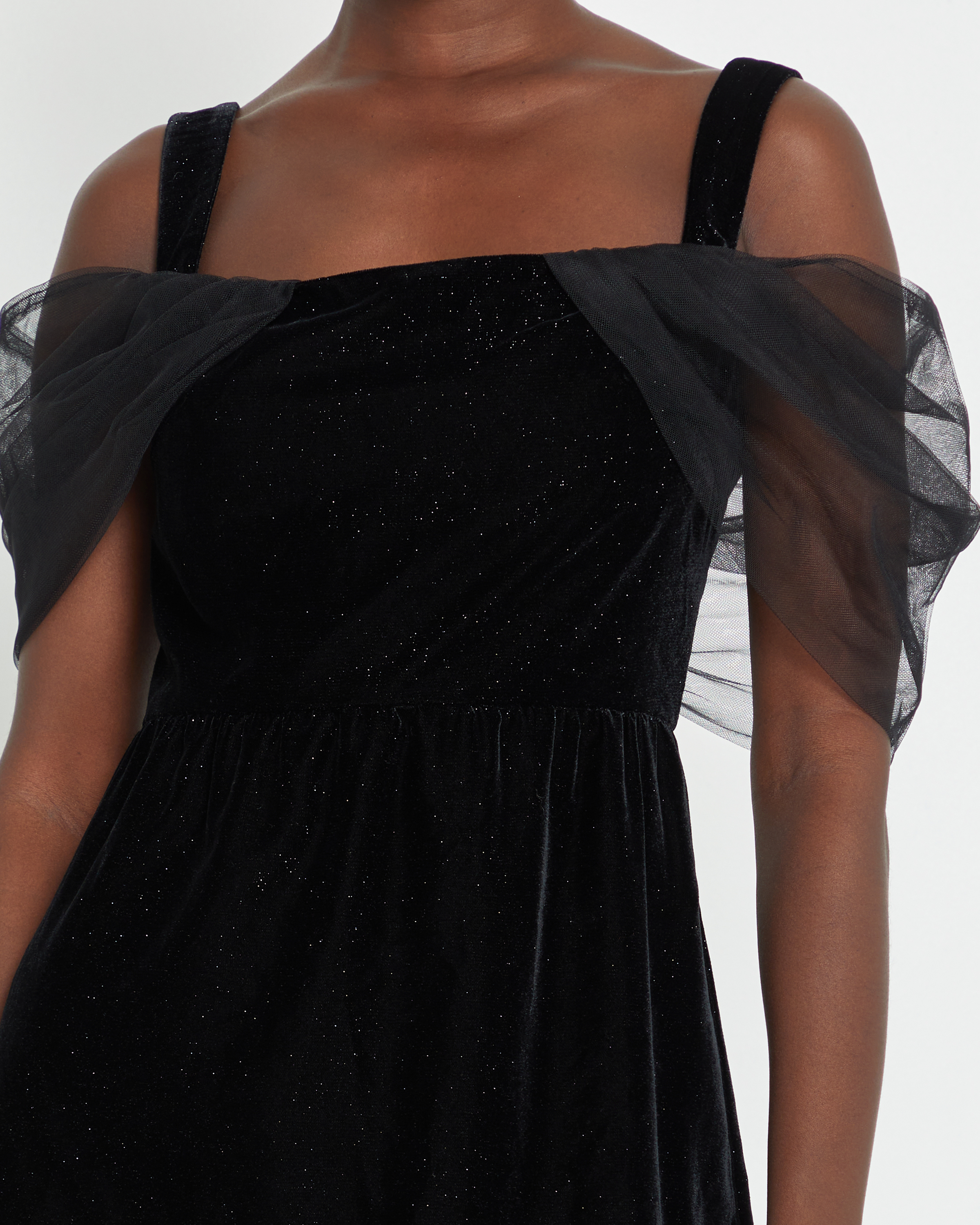 Make a statement in the Devon Dress by adding some sparkle to your wardrobe--crafted in luxurious velvet with glitter-flecked threads, this mini dress will turn heads with its sheer tulle sleeves and adorable design.