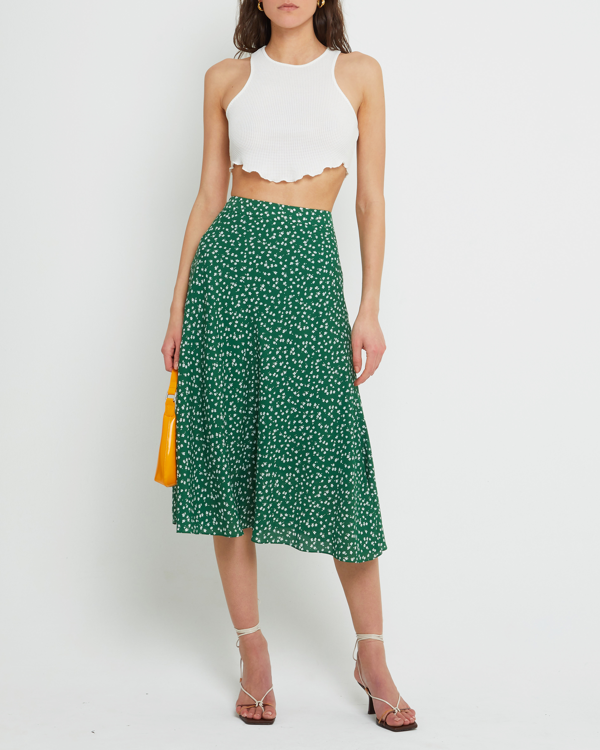 Fun and fresh, this midi skirt is done in a sweet green print with a simple silhouette.