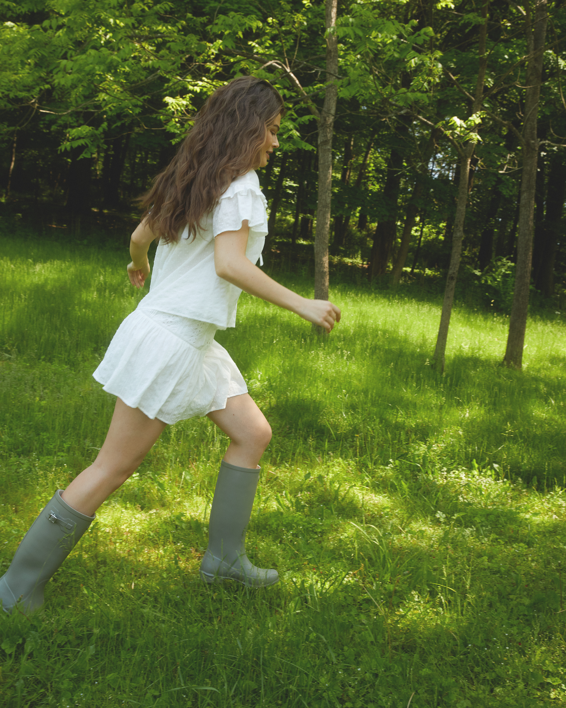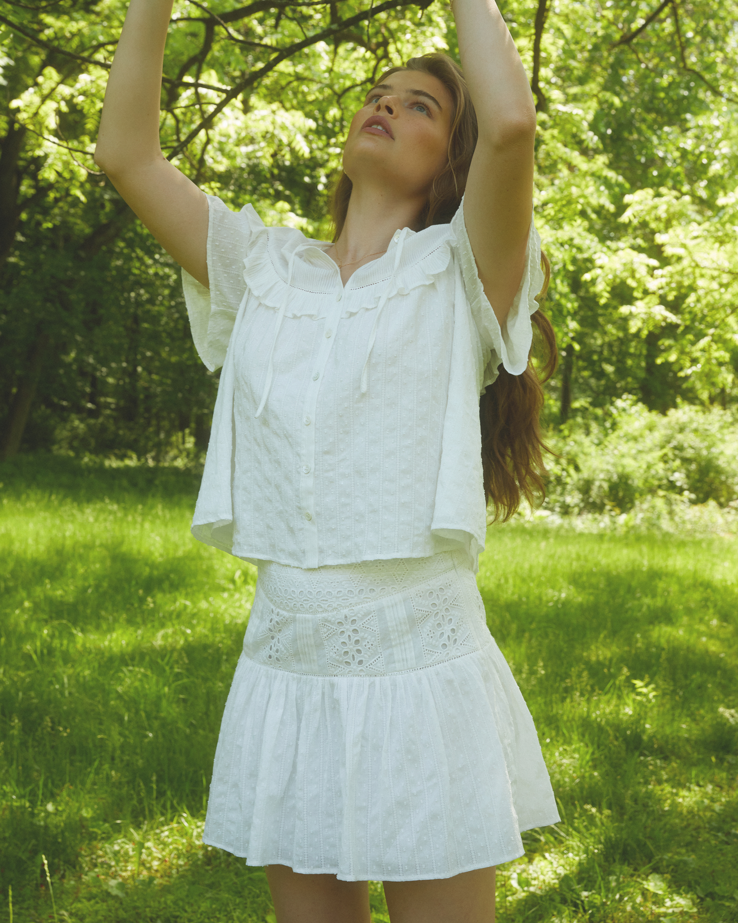 The Faye Cotton Mini Skirt combines mixed eyelet lace panels with fresh, breathable cotton fabric to create a lightweight and airy design. Its breezy silhouette makes it an ideal choice for warm summer days.