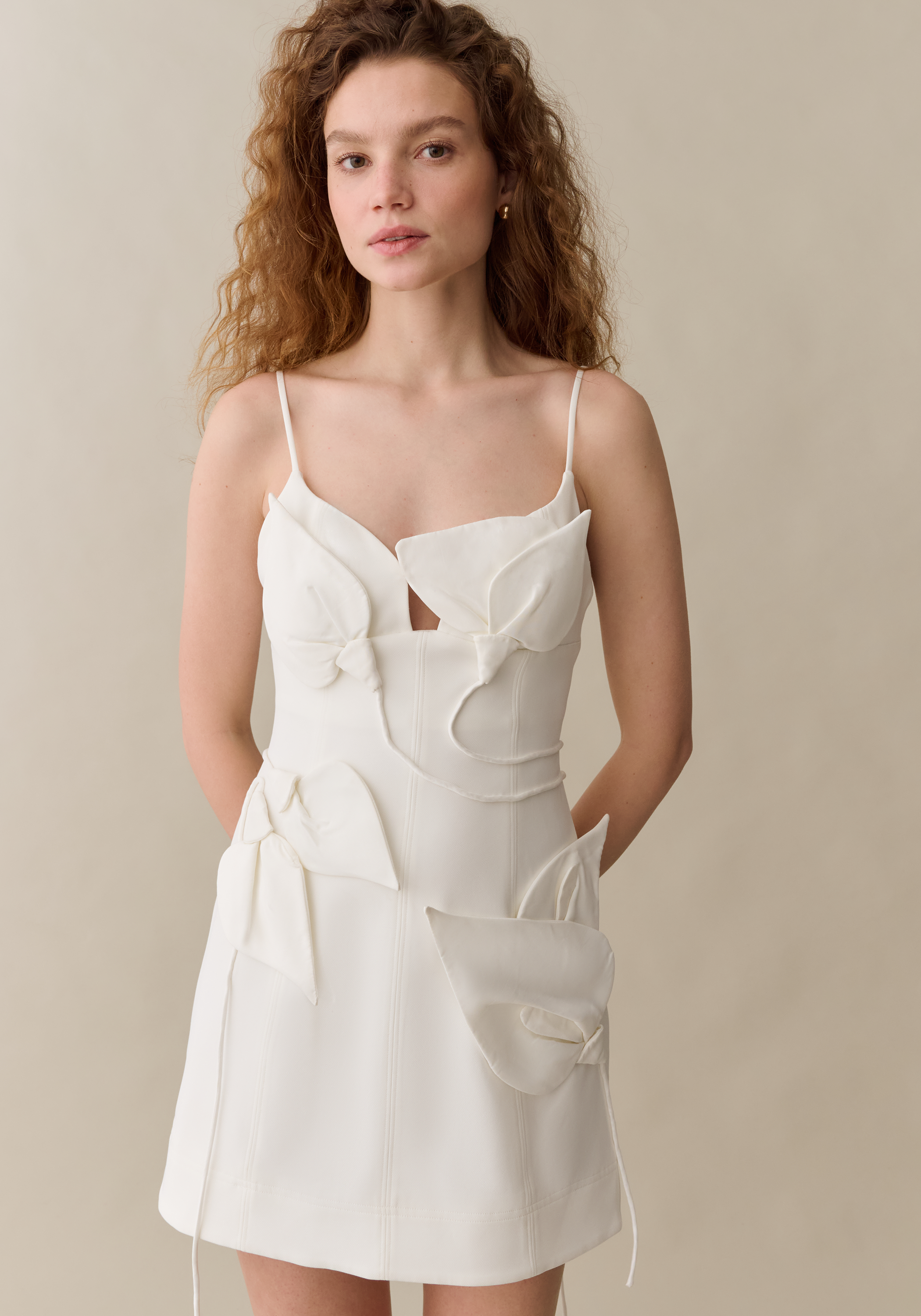 Introducing the Astra Dress - a structured mini dress with intricate detailing and a front keyhole feature. Adorned with individually hand-stitched flowers, this special dress is sure to make a statement at any event.