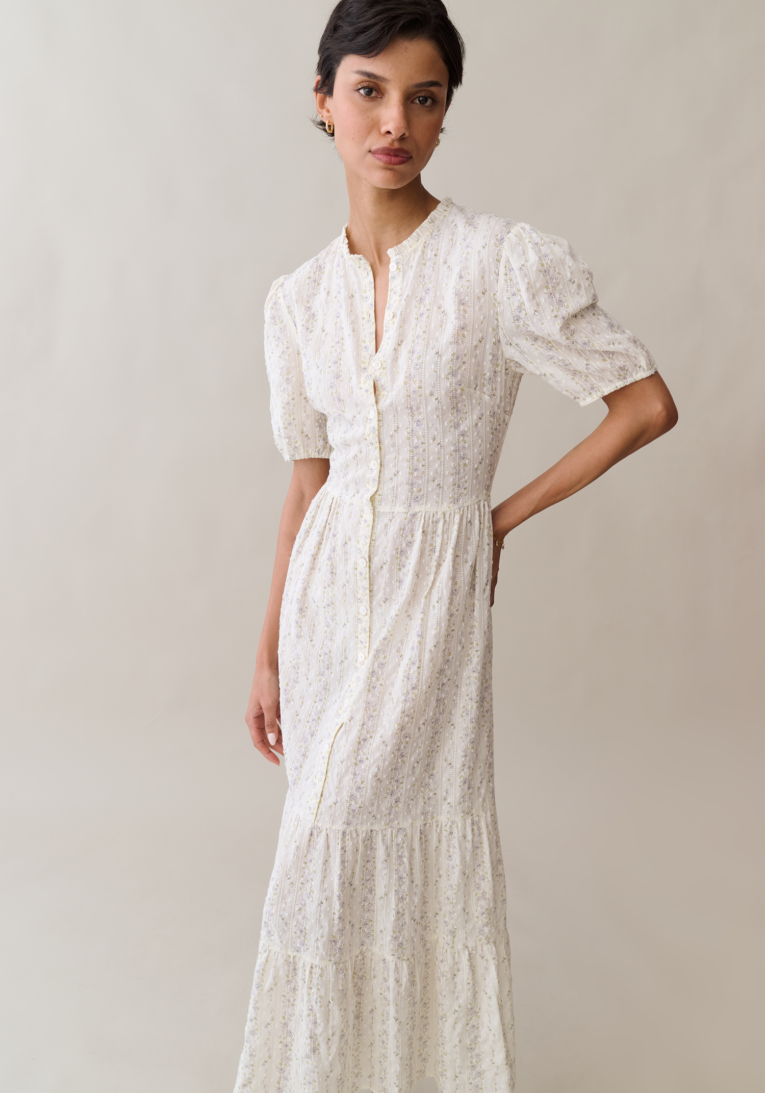 Romantic and effortlessly refined, this midi dress is crafted in a lightweight cotton with a delicate, ditsy floral print throughout. The softly structured bodice features a button-front placket and subtle pintuck detailing, while short puff sleeves add a touch of vintage charm. A gently cinched waist flows into a tiered skirt for graceful movement and an easy, flattering silhouette.