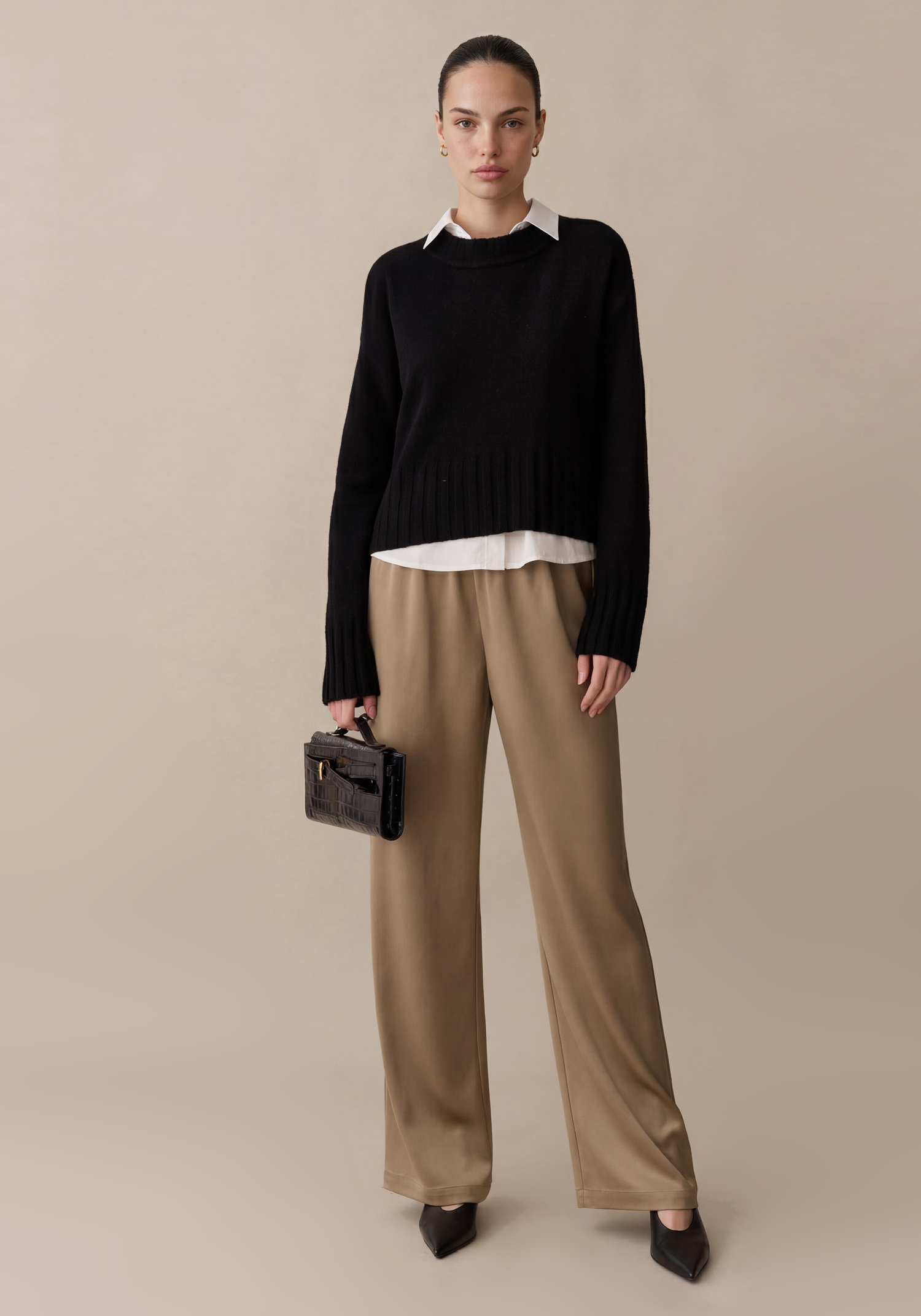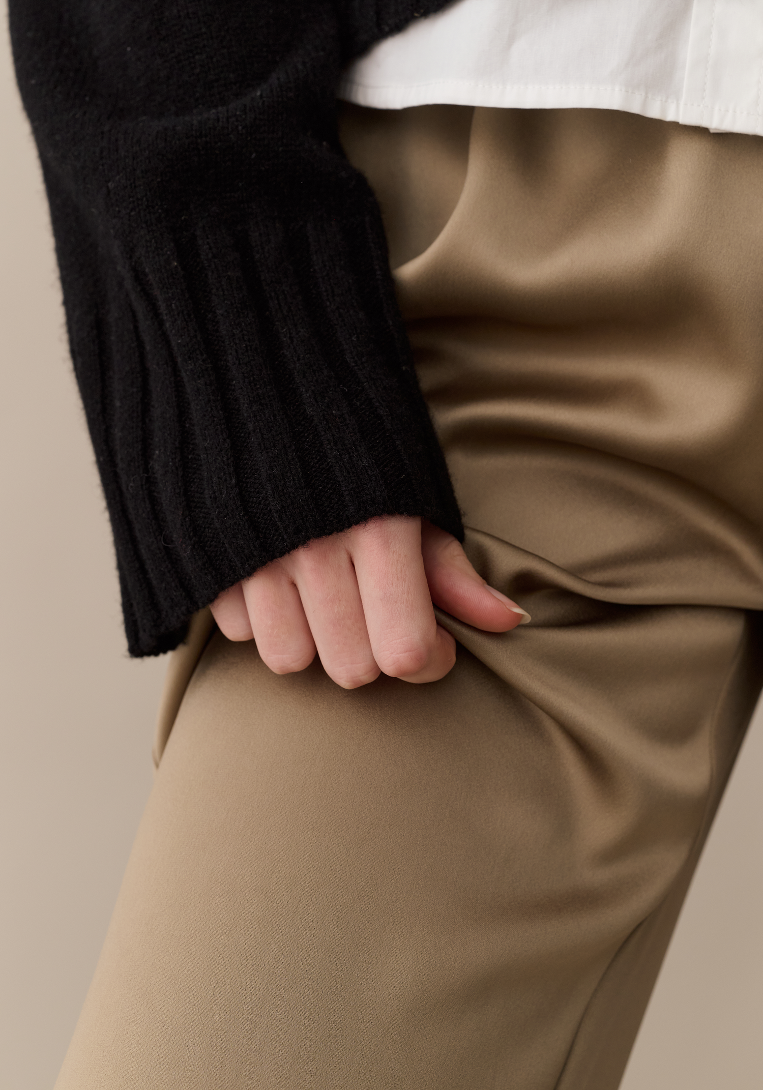 The Selah Pant pairs luxe mid-weight satin with a forgiving elastic waist for all-day comfort. Straight legs deliver a polished, streamlined look that anchors any wardrobe. Understated elegance made practical.