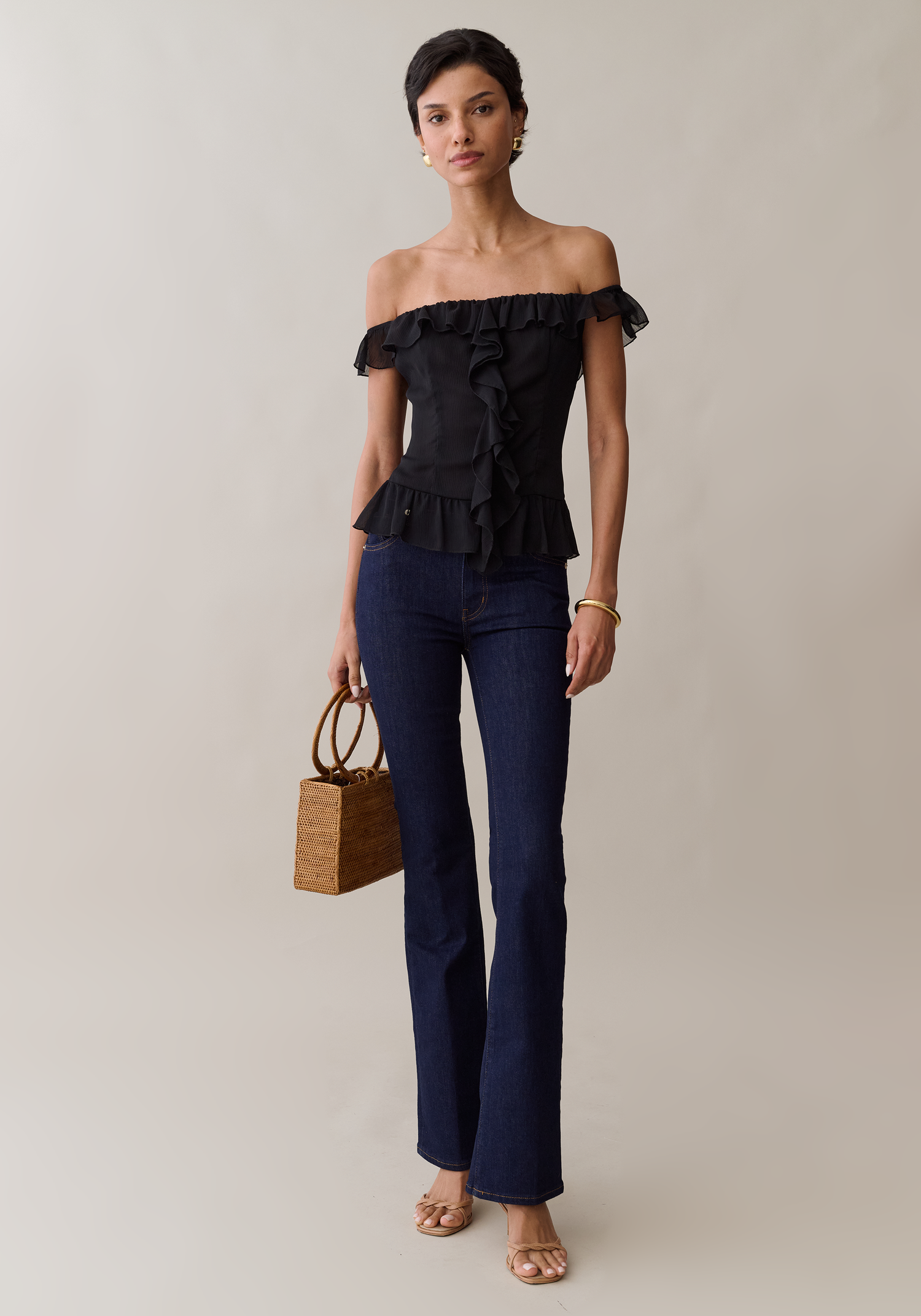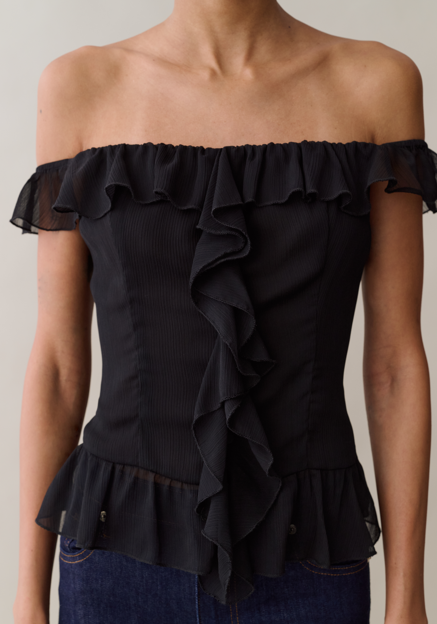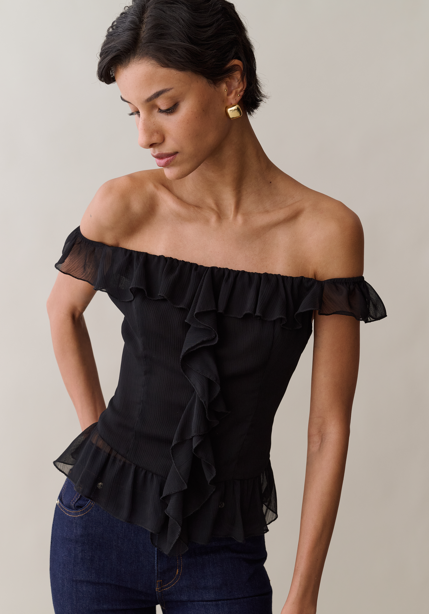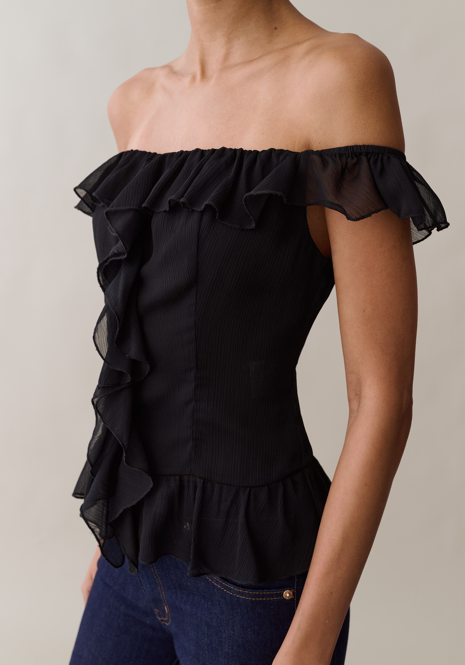 Get ready to meet your new favorite going-out top. This stunning black blouse brings the drama in the best way possible, combining romantic, flirty details with a super flattering silhouette. Featuring a sweet off-the-shoulder neckline and a gorgeous cascading ruffle right down the front, this top is the perfect mix of sweet and sultry.
