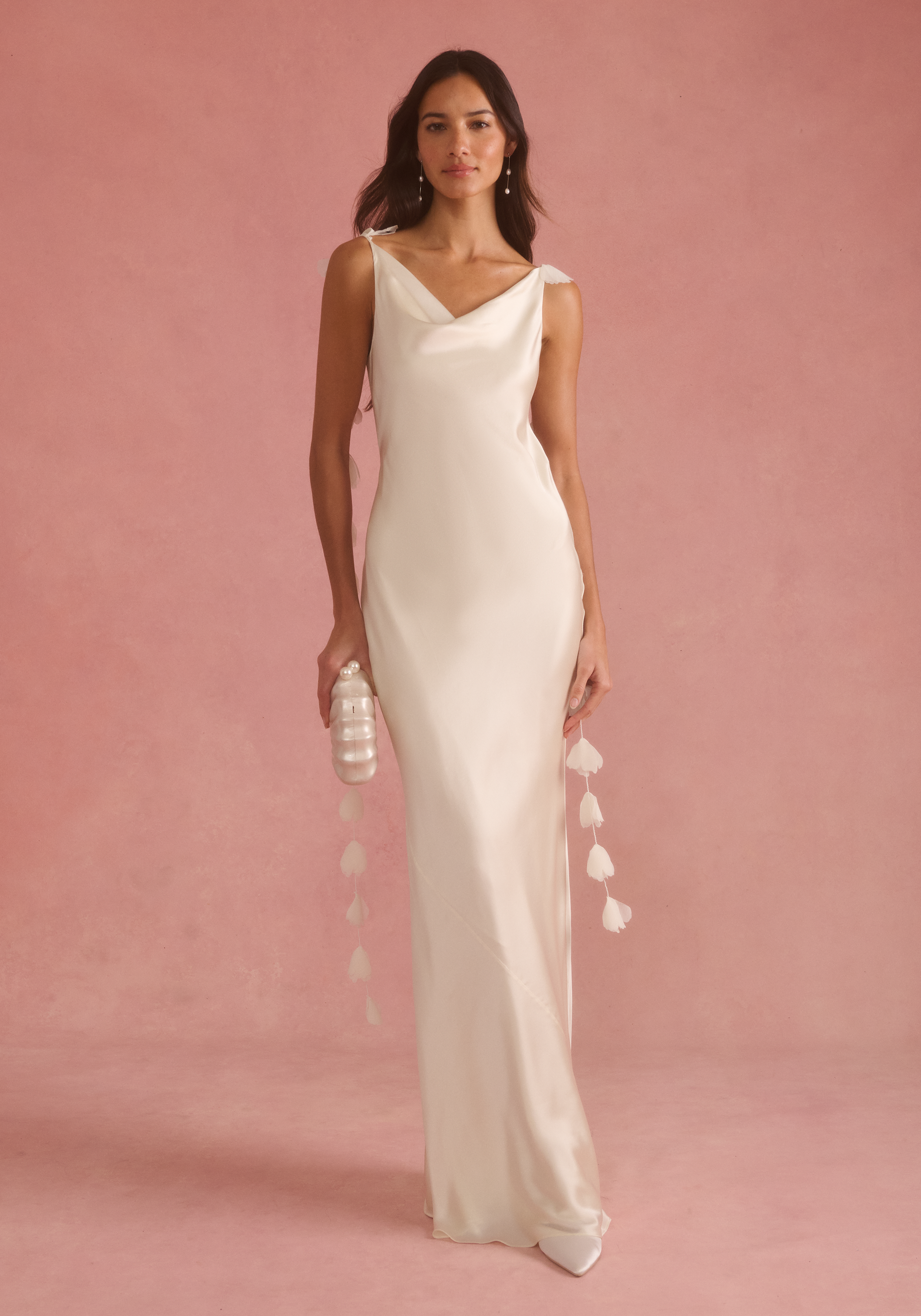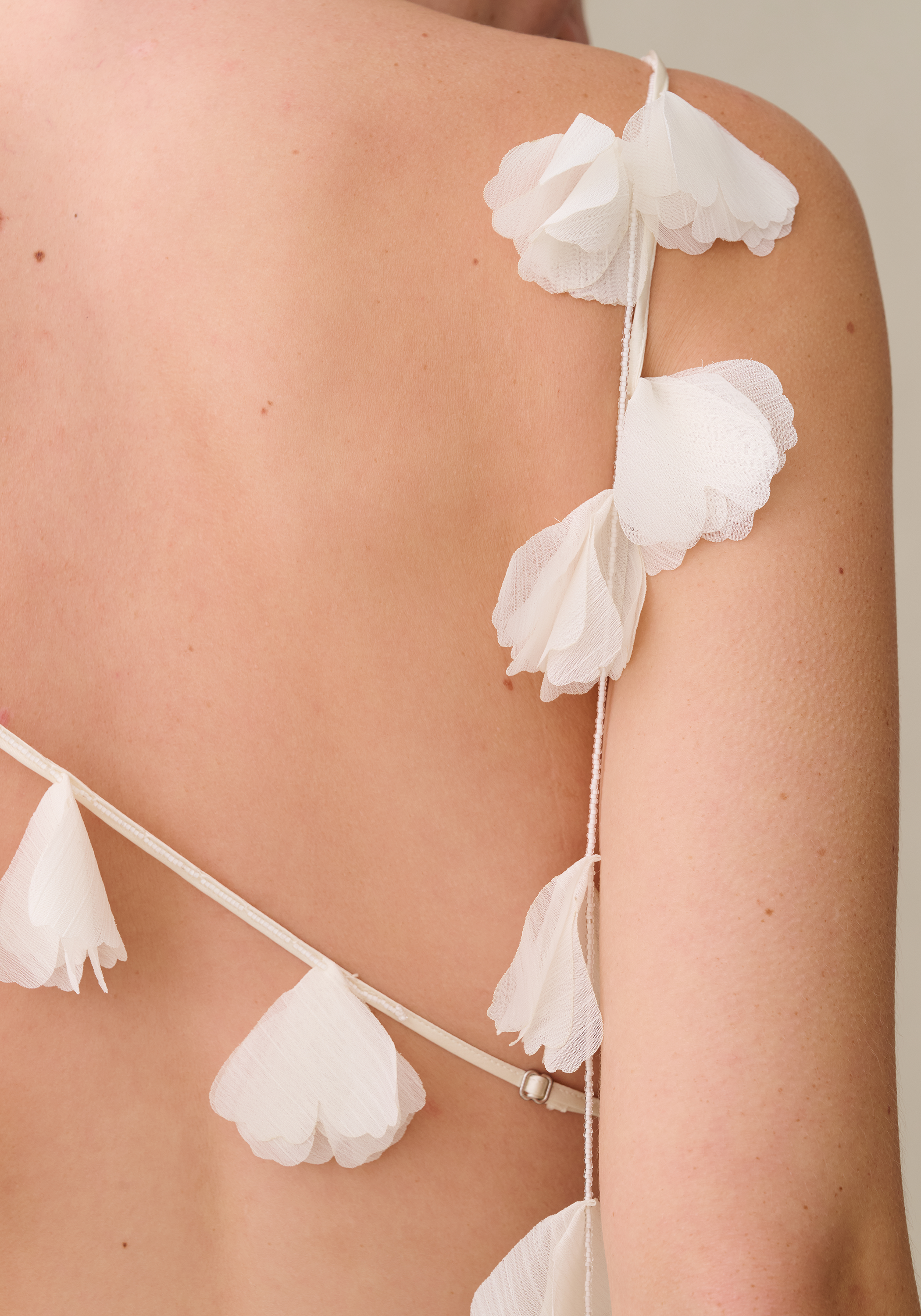 This gown captivates with its fluid drape and sculpted cowl neckline, balanced by an open back adorned with cascading petal tassels. The delicate straps trace the shoulders and back, creating a graceful silhouette from every angle. Ethereal and unforgettable, it’s a showstopping choice for modern soirées and special occasions.