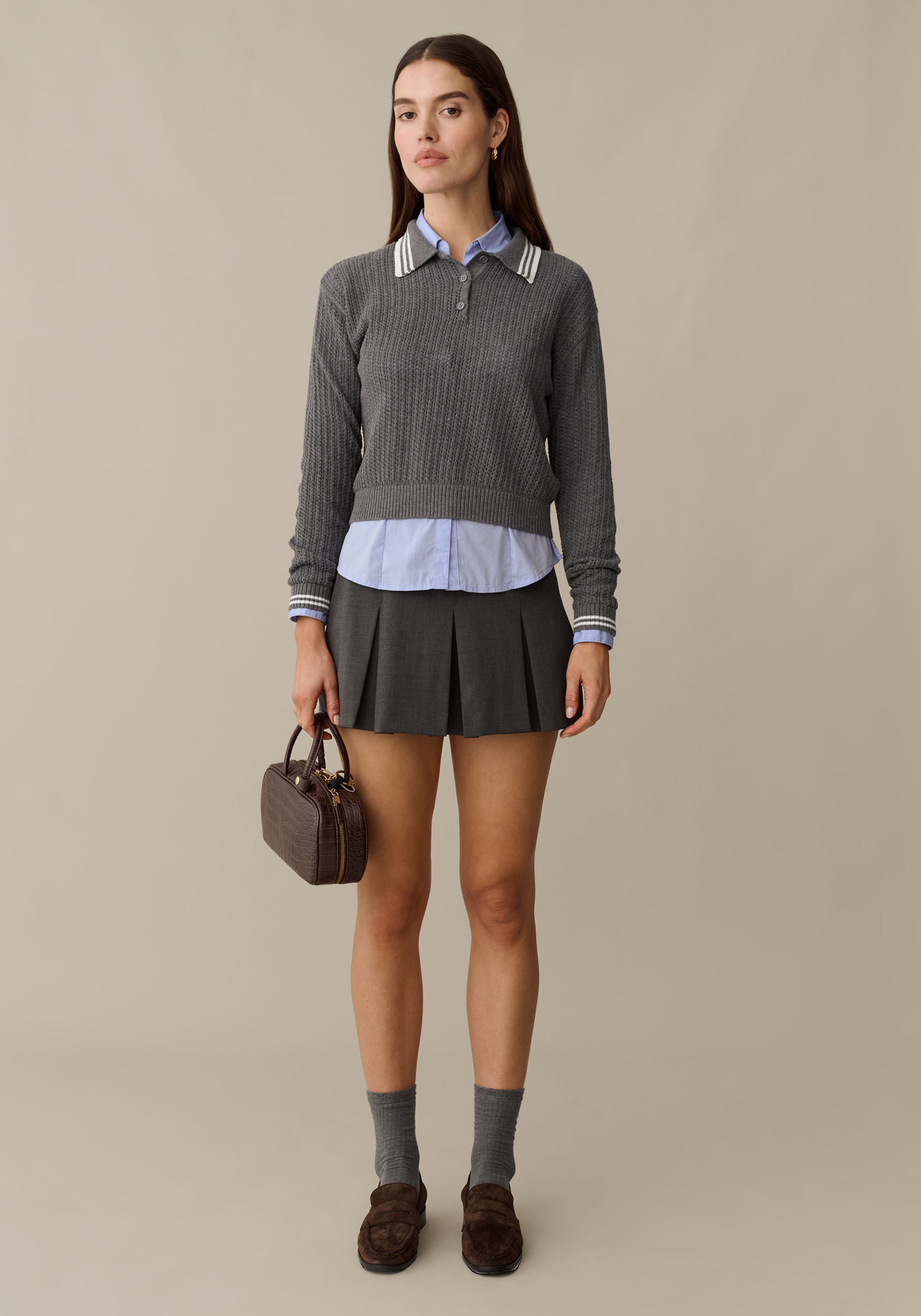 The Alba Sweater features an ultra-light textured knit that offers breathable comfort and effortless style. Its collar detail, accented with crisp white stripes, gives a classic preppy feel. Designed as an easy layering piece, this sweater seamlessly integrates into your wardrobe for versatile, polished looks.