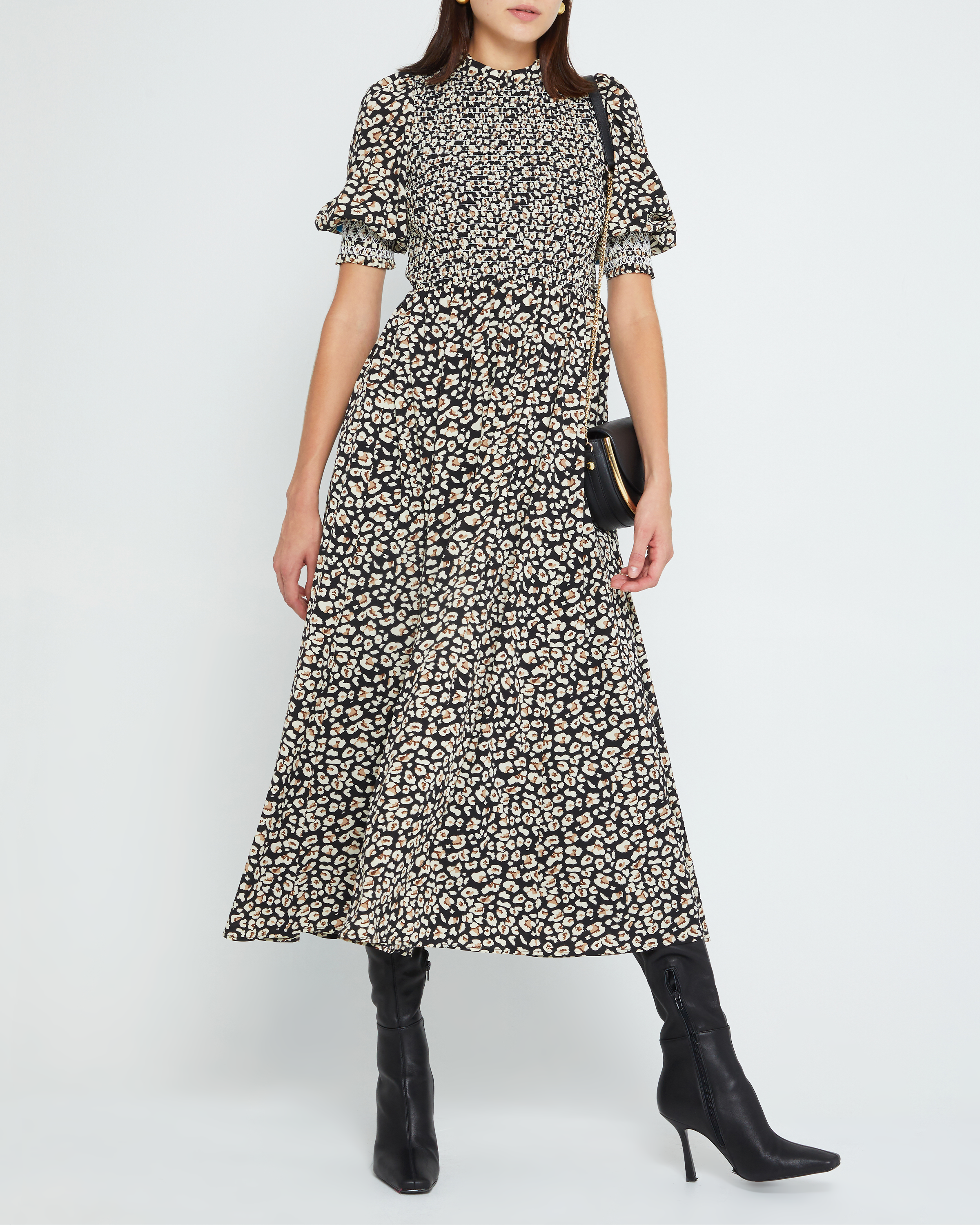 Smocking and embroidered details takes the fun print of this chic style to the next level. Finished with an inner lining.