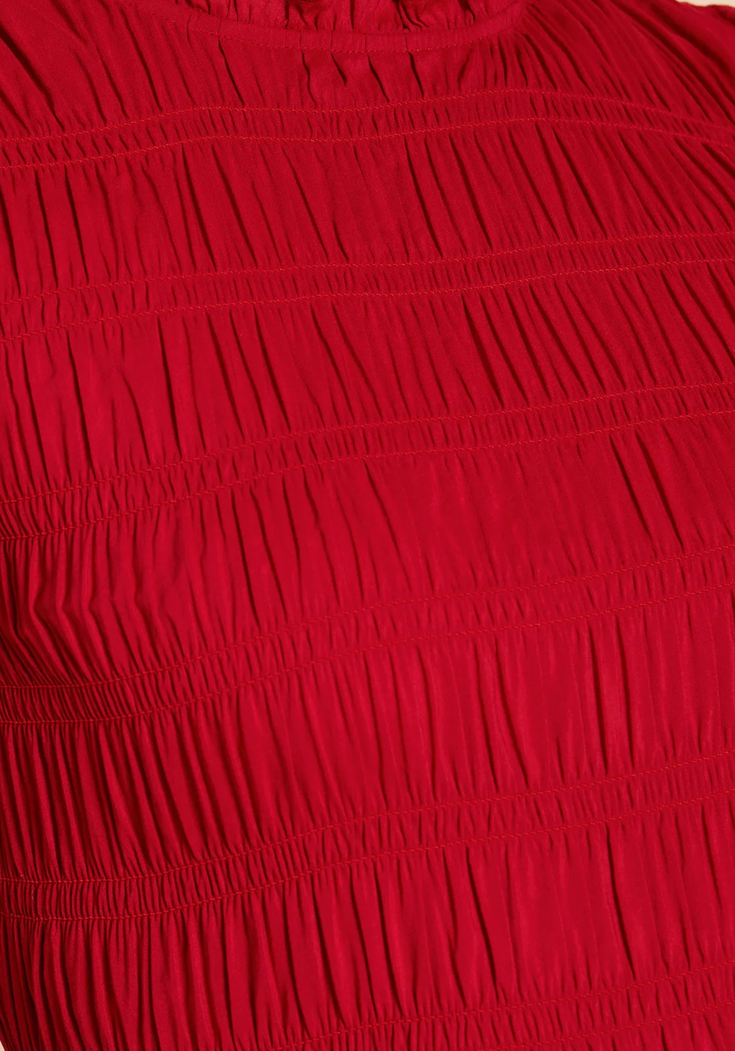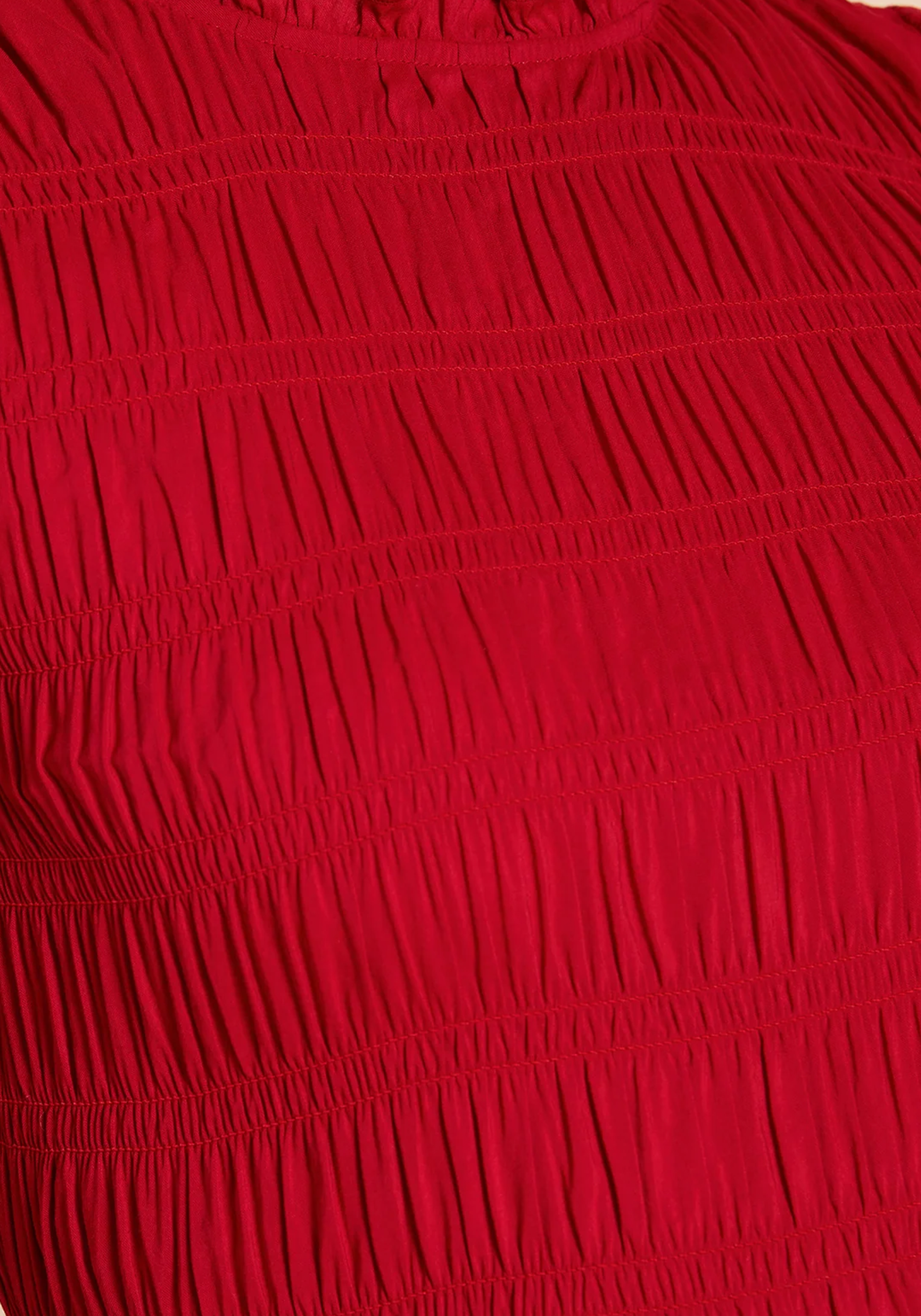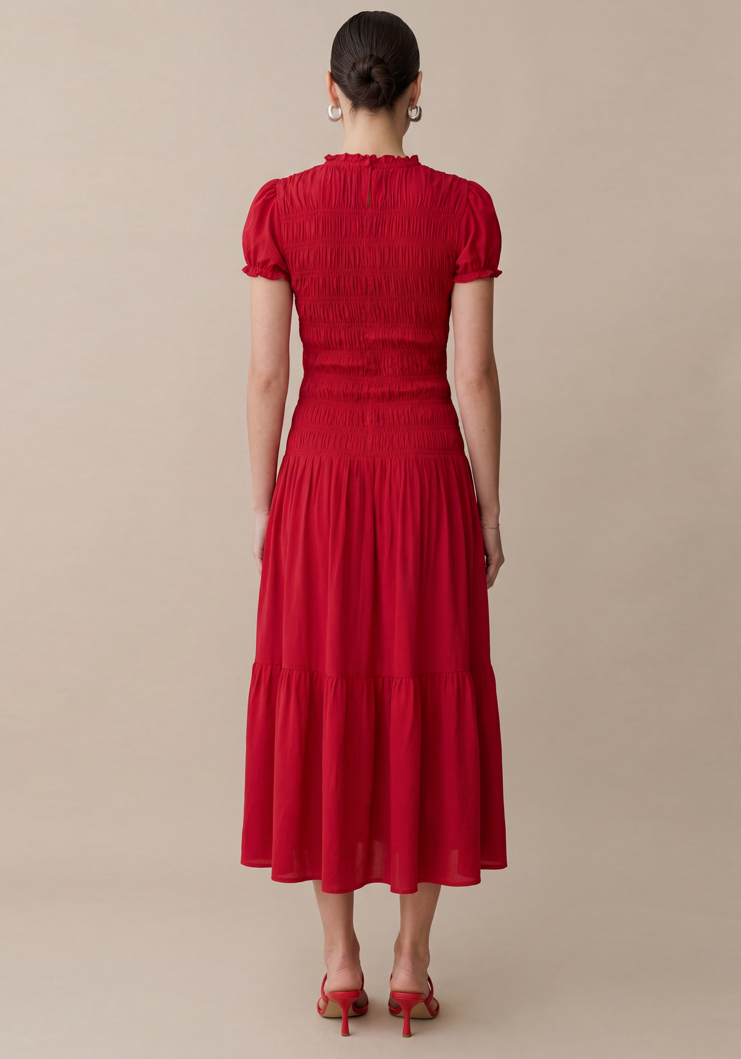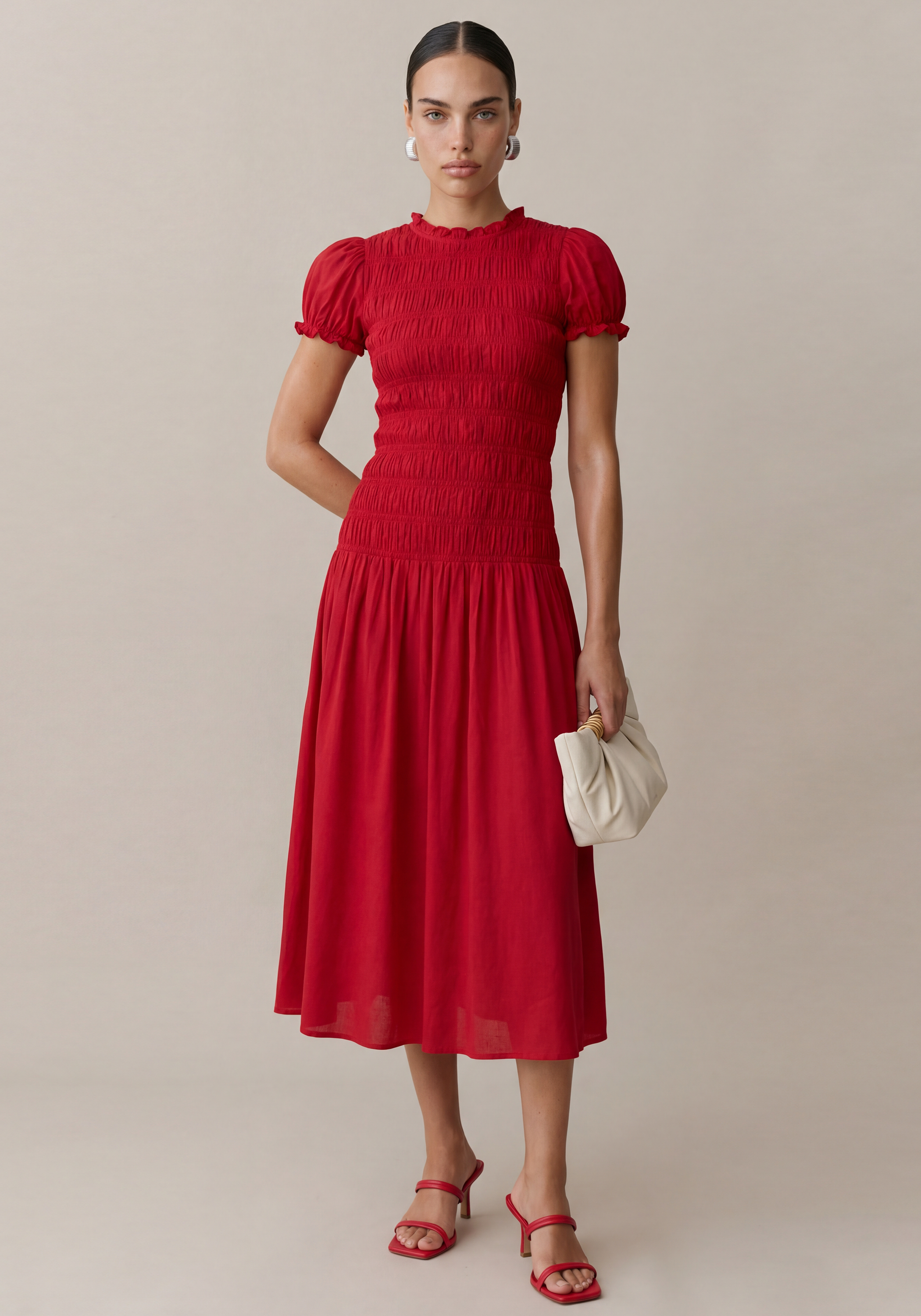The Ainsley Dress features a high neckline, charming puff sleeves and a technical drop waist. Its smocked bodice provides precise fit with comfort, transitioning to a flowing skirt for breezy movement.