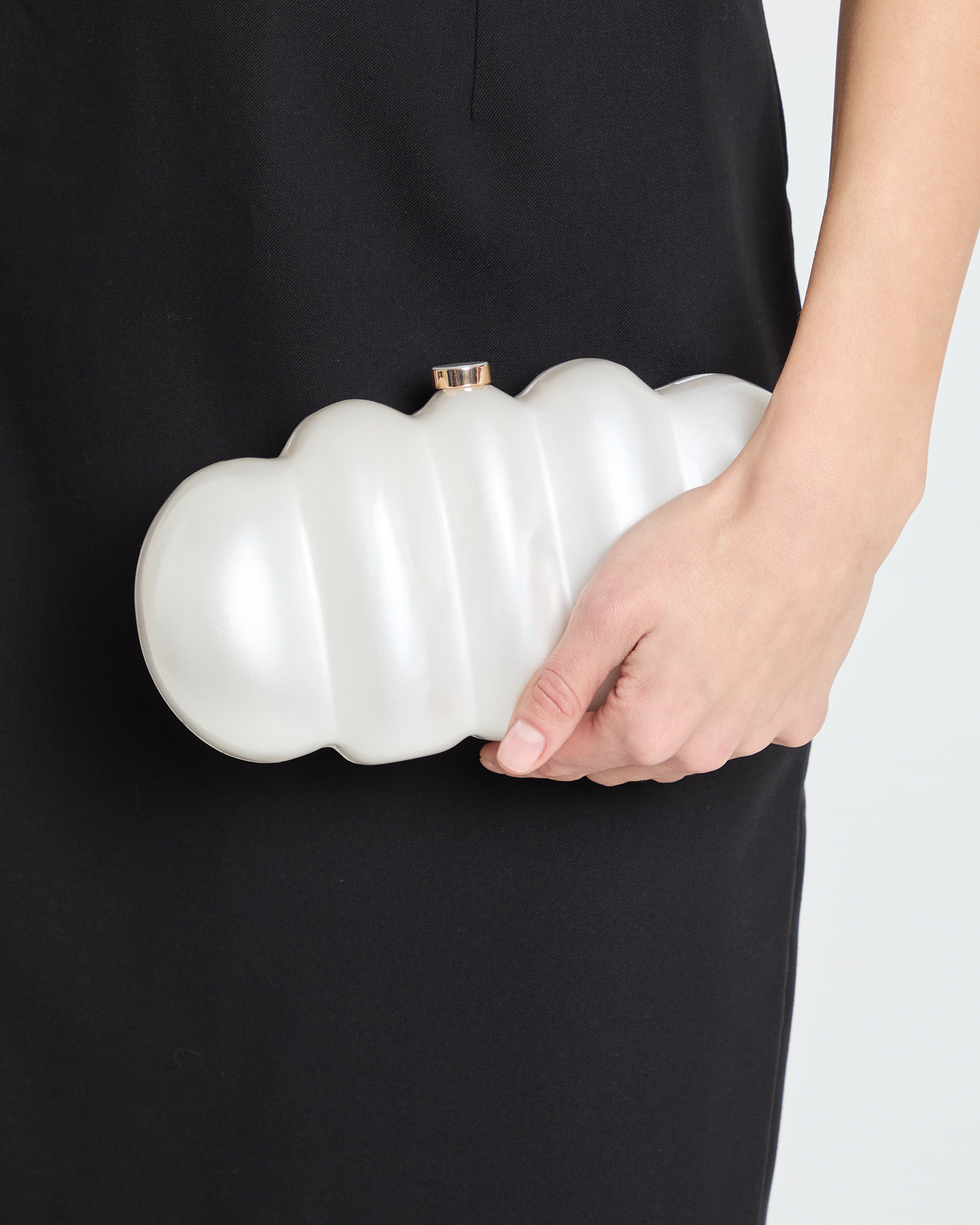 This Amara Cloud Acrylic Clutch features a stunning pearlescent finish and sculptural design. Its sleek clutch style is accented with elegant gold details. Elevate any outfit with this sophisticated and unique accessory.
