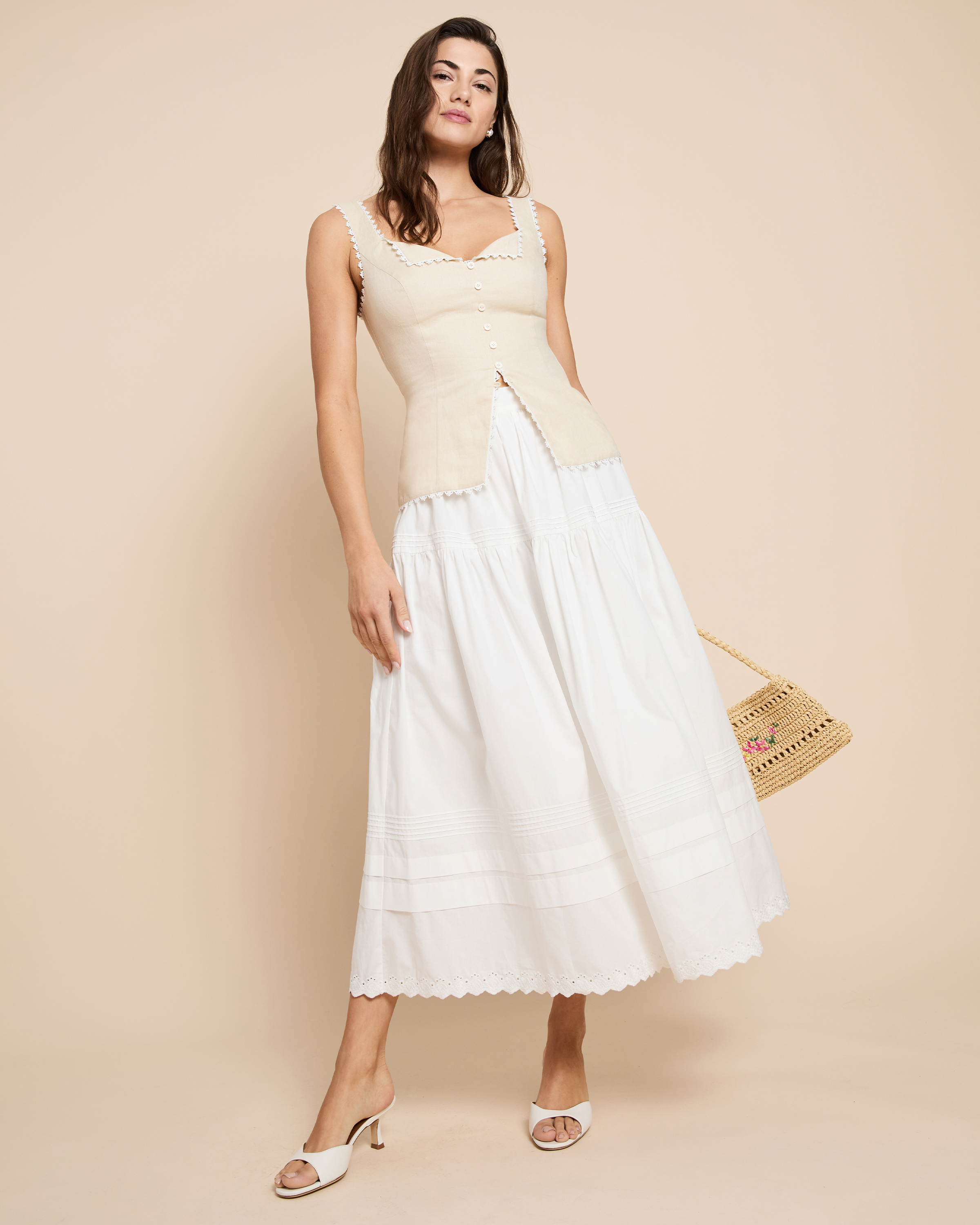 The Ambrose Linen Top showcases premium cream linen fabric adorned with charming white lace trim. Designed with a flattering fitted silhouette, it features supportive thick straps, elegant front button details, and an adjustable waist tie that allows for personalized comfort and styling. This versatile piece balances refined craftsmanship with practical wearability.