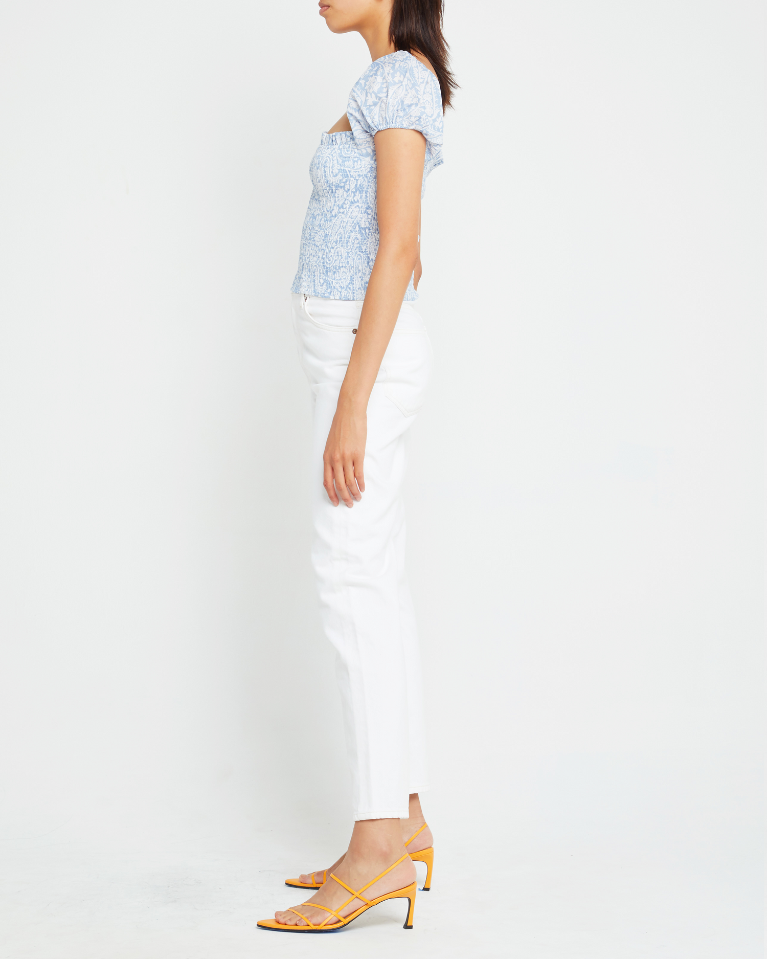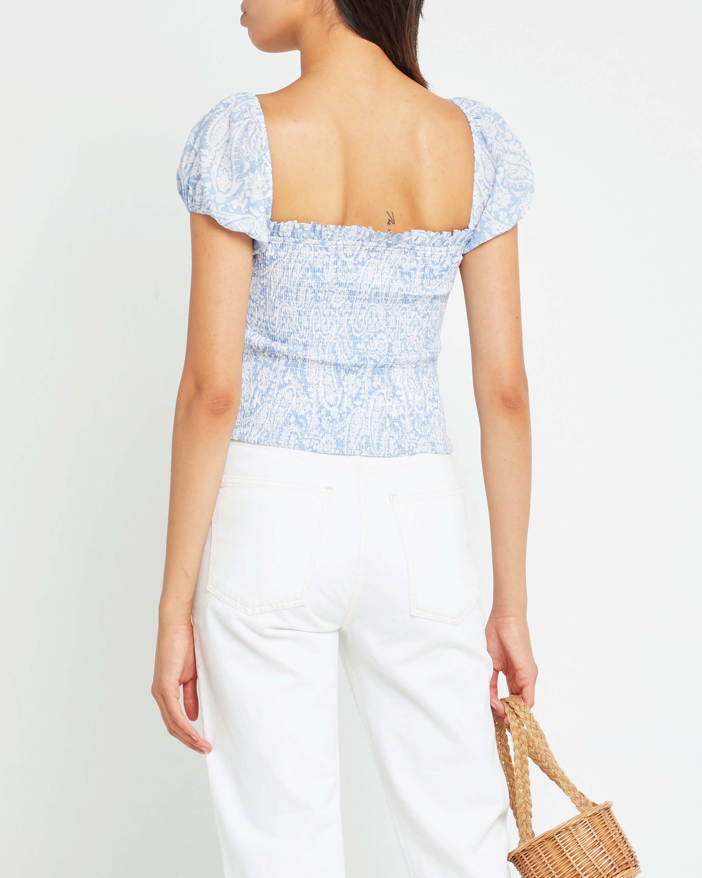 This fresh cotton blouse is done with a smocked bodice and puff sleeves. Finished in a pretty print with a ruffle along the neckline.