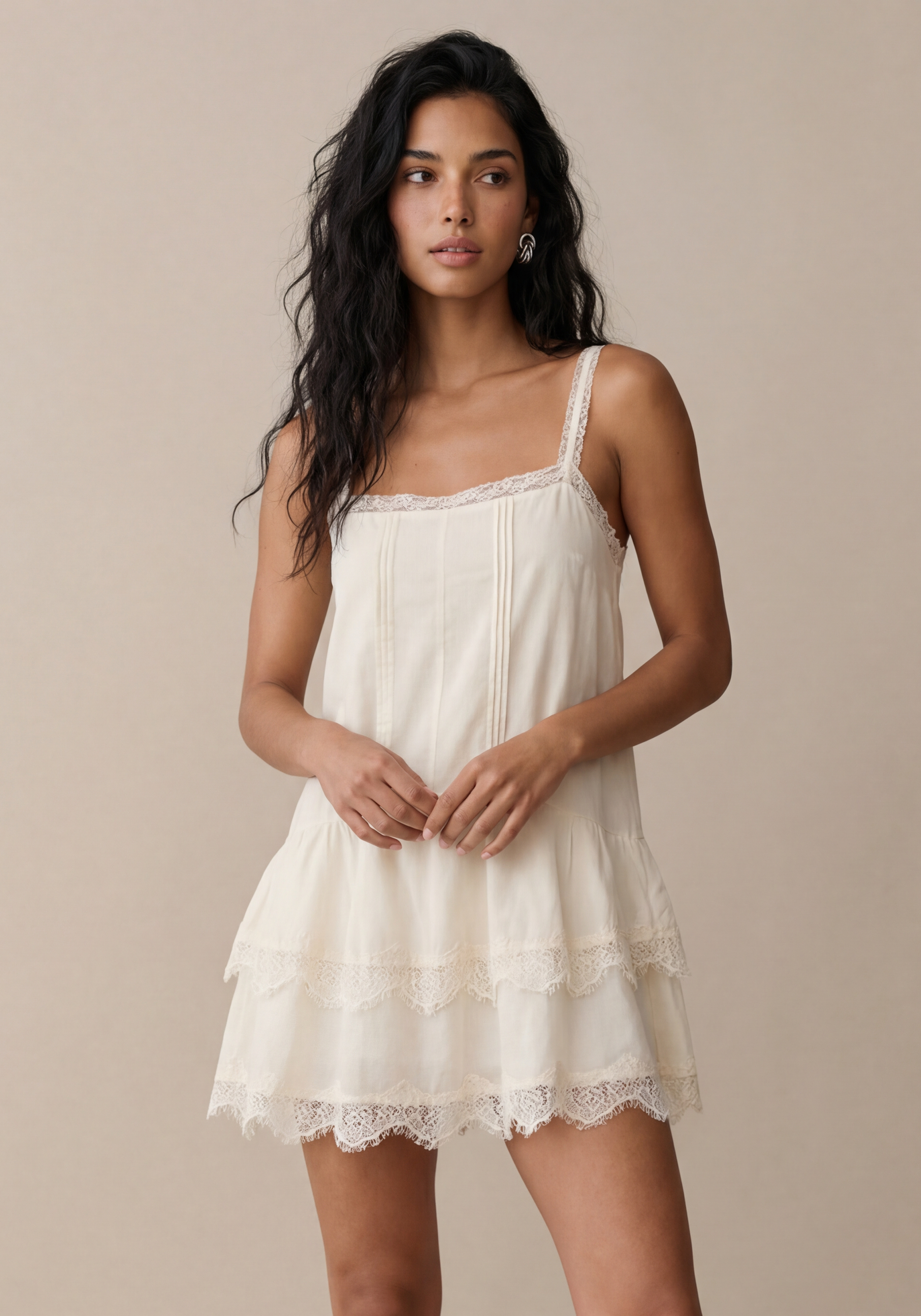 Delicately detailed with lace trim and paneling, this dress features a tiered ruffled skirt for a stunning silhouette. The relaxed fit and lightweight, breezy fabric make it perfect for any occasion.