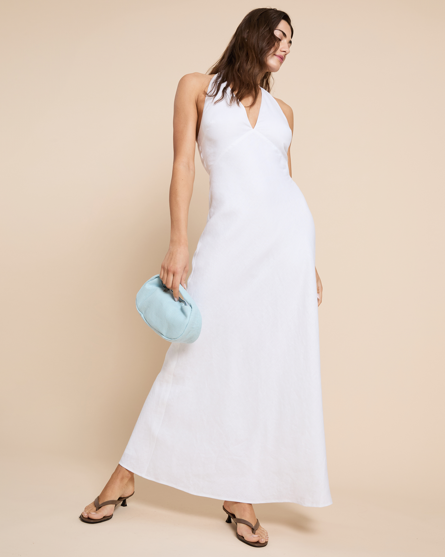The Ashlyn Linen Dress exudes simplicity and timelessness with its easy silhouette and halter neckline. The open back and delicate covered button details add a touch of elegance. Crafted from high-quality linen, this dress is both comfortable and stylish.
