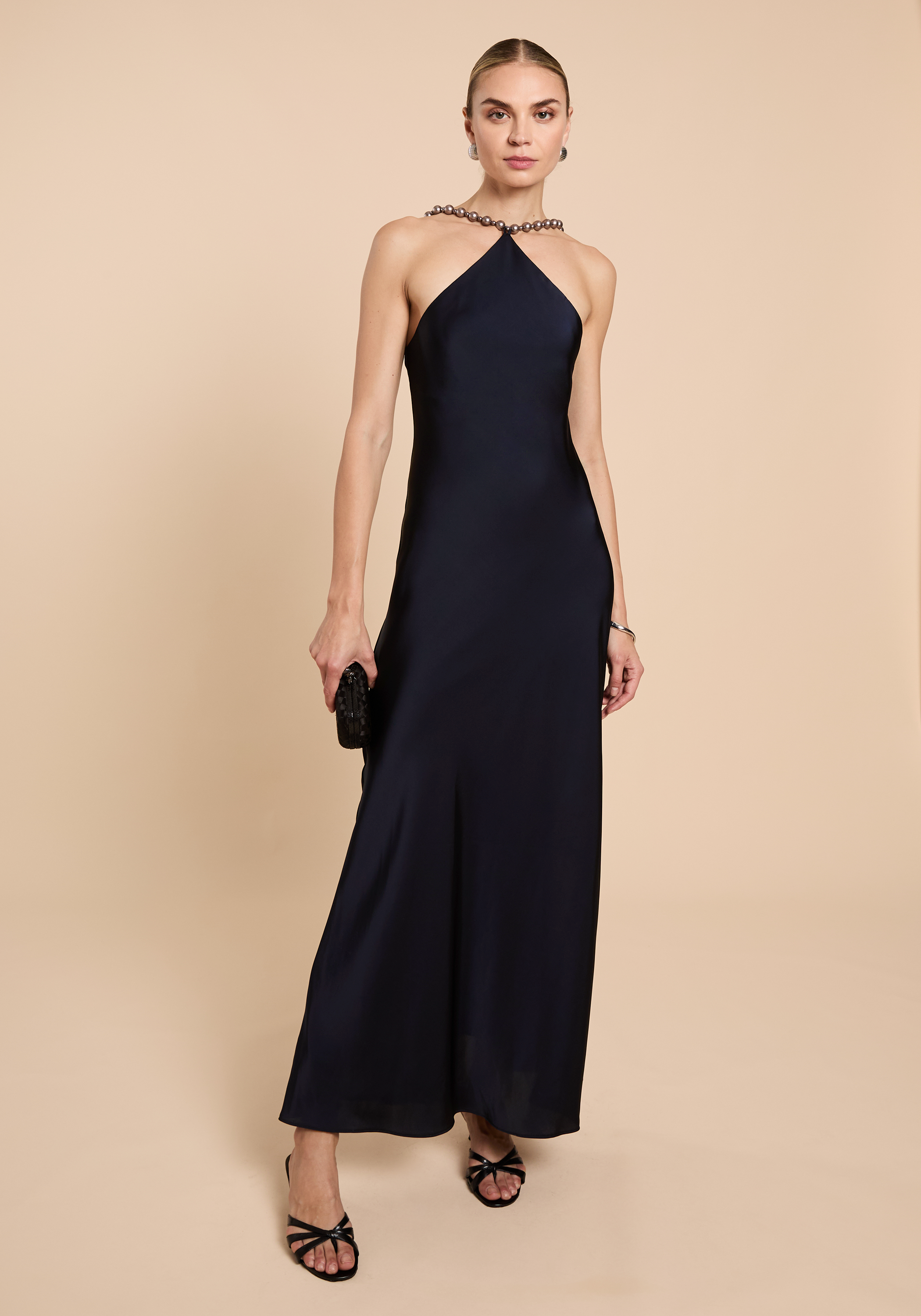 The Auli Dress features a luxurious navy silky fabric that drapes elegantly for a sleek, chic silhouette. Its standout detail is the delicate silver pearl bead embellishment along the neckline, adding a unique and sophisticated touch.