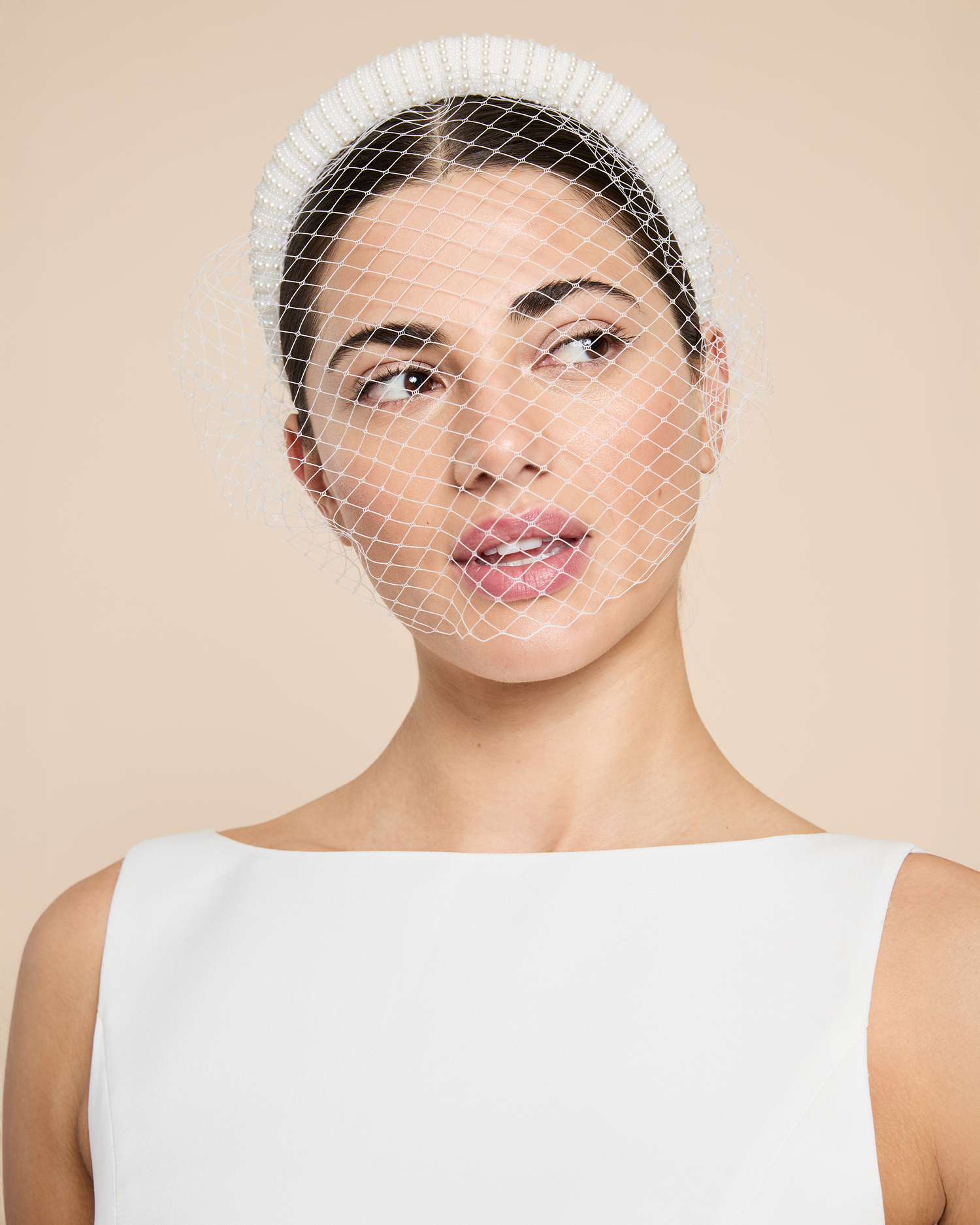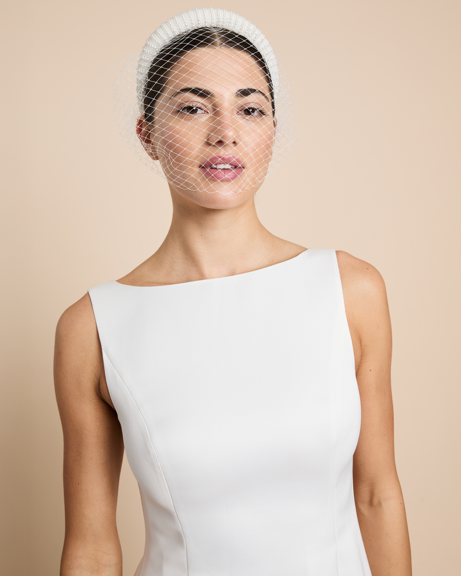 Look perfect in pearls. This pearl headband is finished with a classic birdcage veil for the most timeless and romantic look.