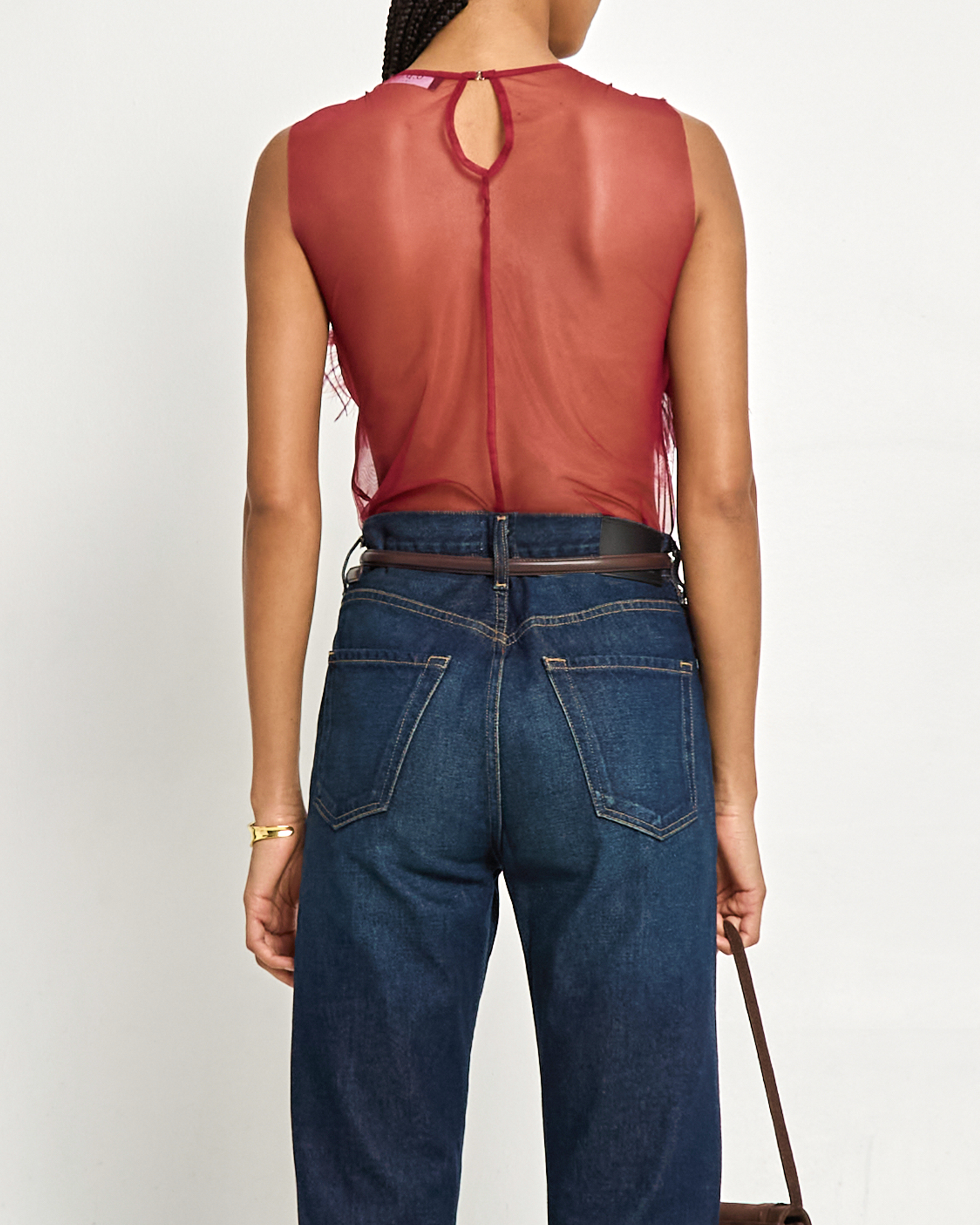 Stand out in this stunning, feathered top. Done in effortlessly elegant burgundy with a chic, mesh bodice.