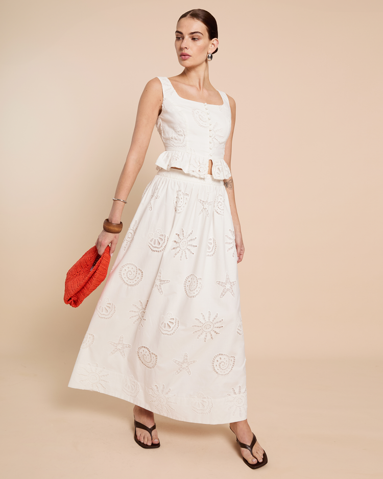 The Celeste Cotton Set combines structural elegance with summer comfort. The top features a tailored silhouette with a delicate peplum detail. Finished with a flowing maxi skirt crafted from 100% cotton with a fun, eyelet lace pattern.