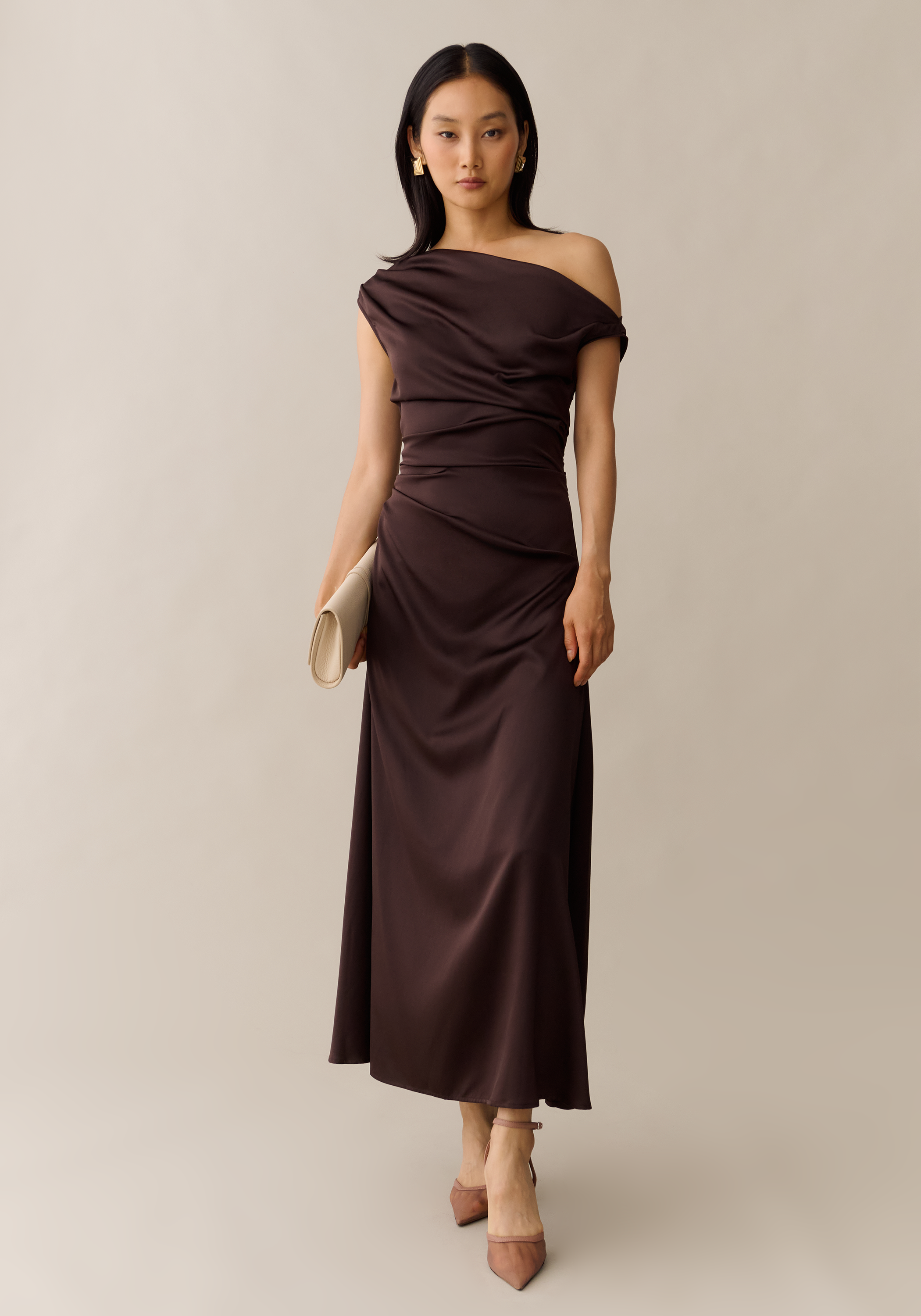 Elevate your evening look with the Ciela Dress, featuring a rich deep brown hue and silky fabric that drapes effortlessly. Its asymmetrical, off-the-shoulder design adds a touch of modern sophistication, while the fitted waist flatters your silhouette for an elegant finish.