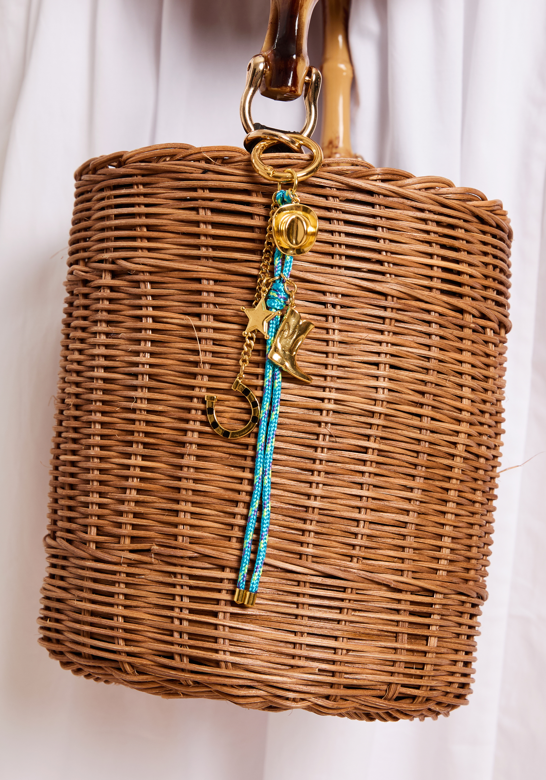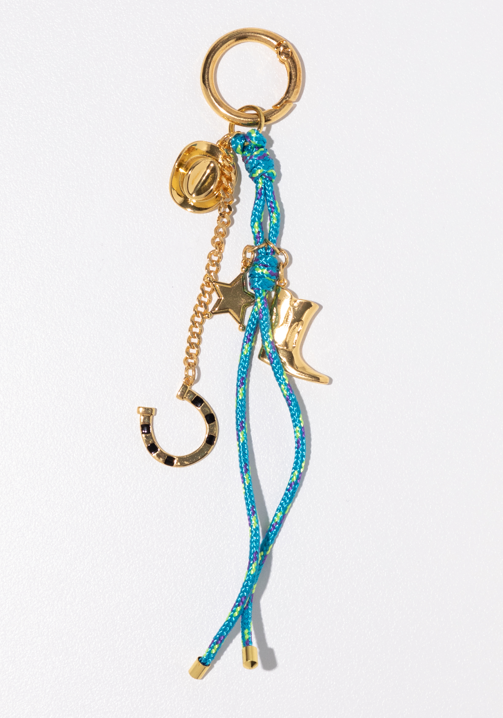 Add some western flair to any outfit with the Cowgirl Charm. Featuring a vibrant turquoise lanyard and accented with gold charms including a boot, hat, horseshoe, and star, this charm is full of fun details. Made with a small ring clip clasp to ensure secure and easy attachment.
