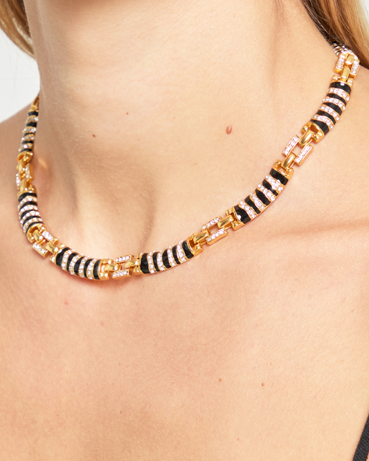 Experience the perfect combination of style and class with our Crystal Enamel Zebra Stud Earrings. Featuring sleek black enamel and sparkling crystal stripes, these earrings are set in gold and designed to elevate any outfit.
