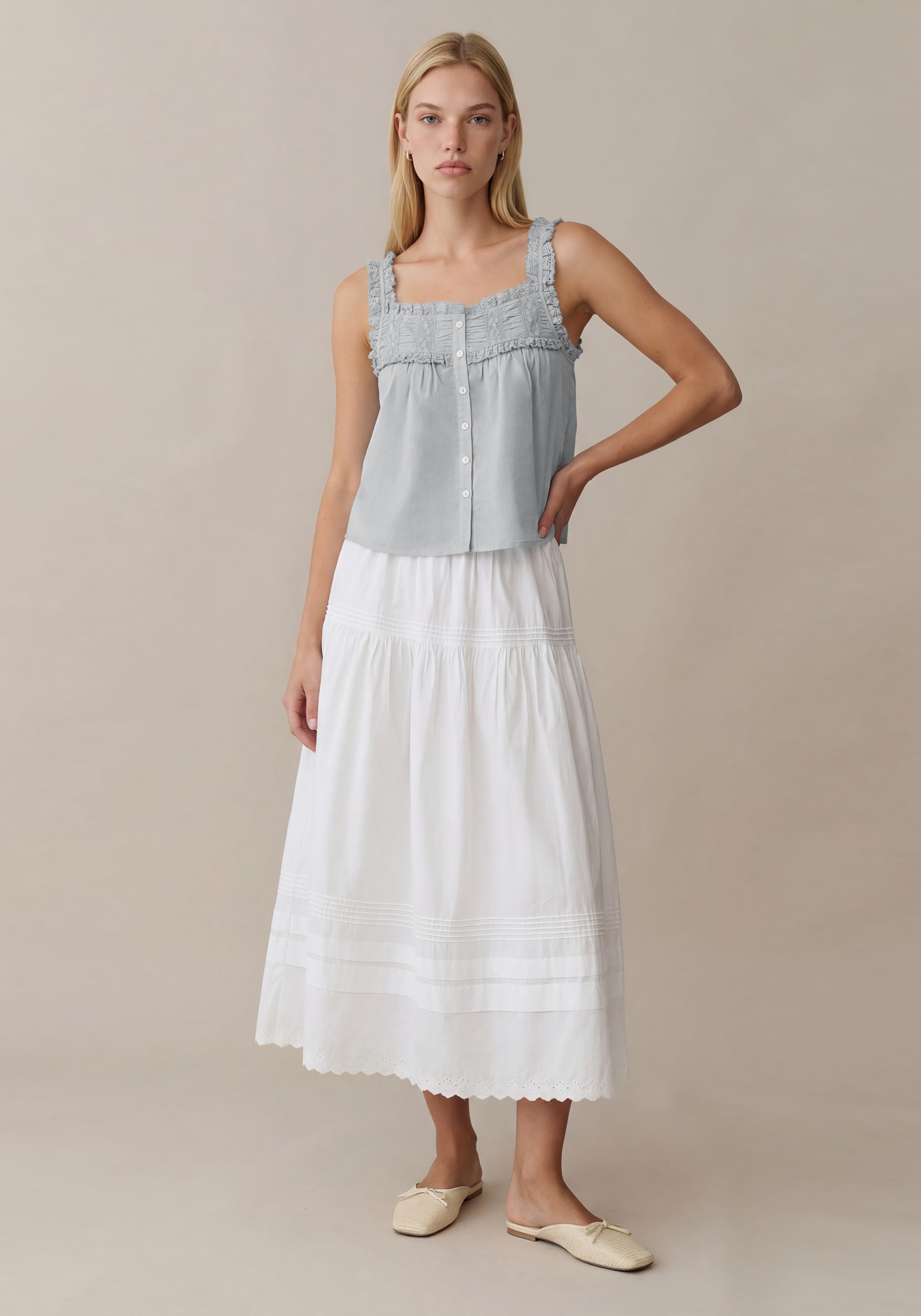 The Etienne Cotton Top combines breathable cotton with elegant lace detailing for effortless style. Front button closure makes it easy to layer or wear open, while the delicate design keeps things light and airy. Perfect for warm weather dressing.