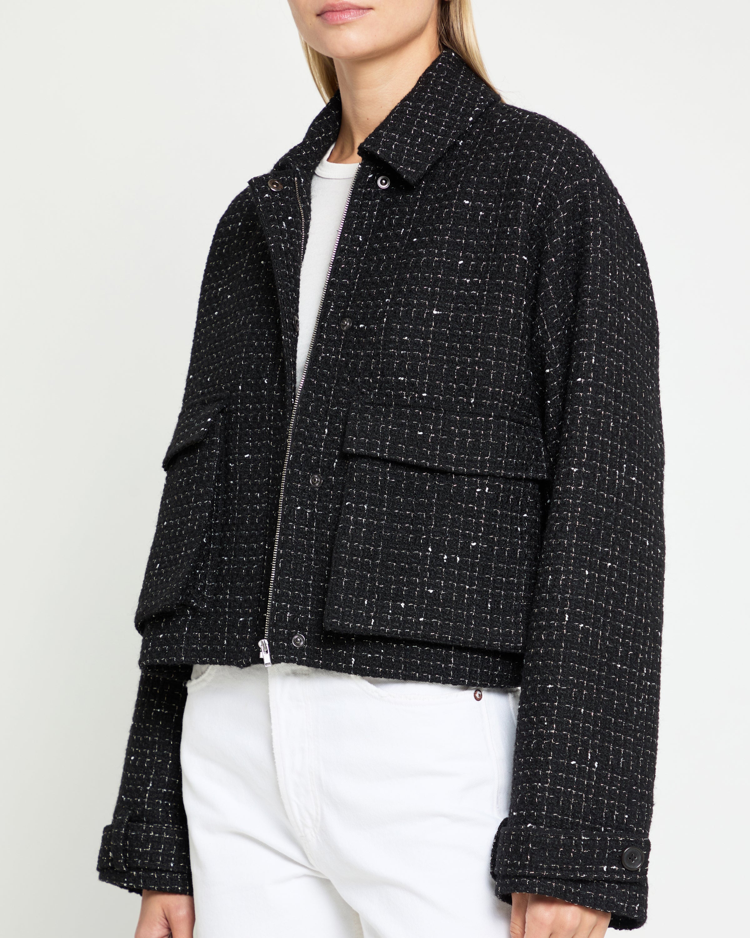 I love this jacket! It's so cute and versatile. I love the mix of a preppier material like this with edgier elements like the front pockets. So disappointed in how large this runs, the XS is sold out right now so I ordered the S hoping it would only be a little bit too big and could have an oversized look but definitely too big for that. Love it so much that I'm going to wait for the XS and also see if the S fits my mom so I can give it to her.
