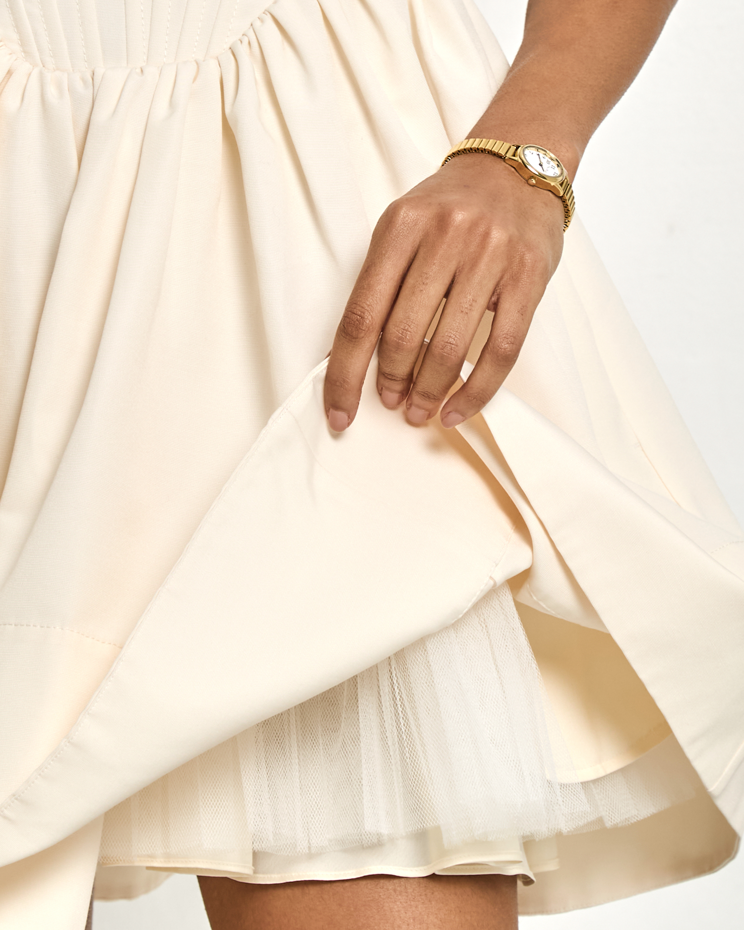 Take your style to the next level with the Harlyn Corset Dress. This dress features internal shapewear, providing a super structured corset bodice with boning for a secure and flawless look. The fun and flouncy skirt is fully lined with tulle, giving you a full and fabulous effect. Complete with an elegant square neckline, this dress is perfect for any occasion.