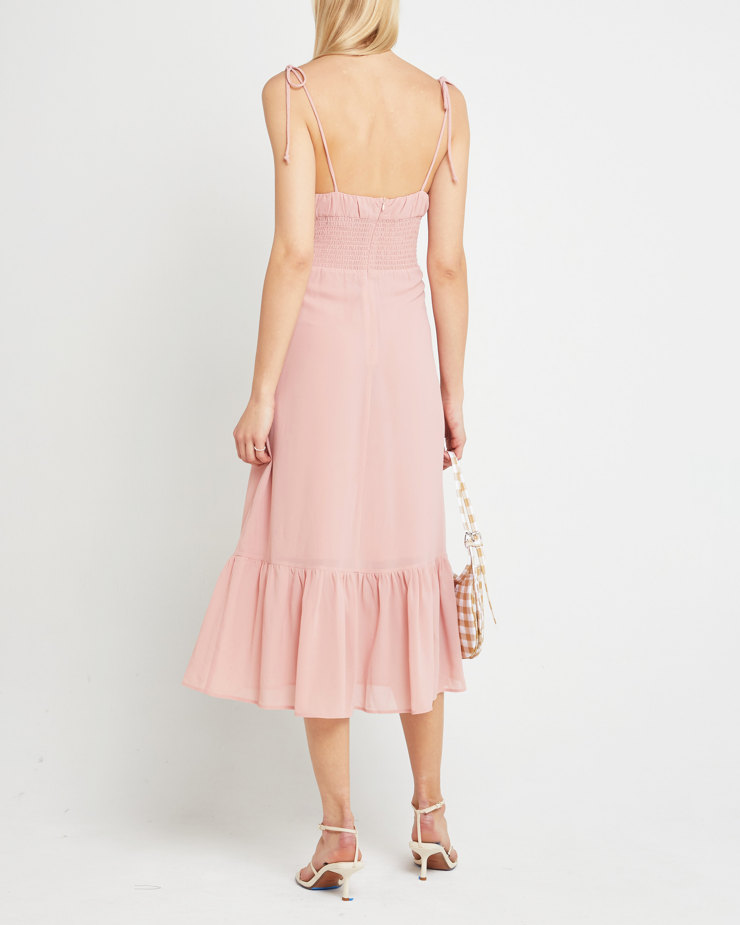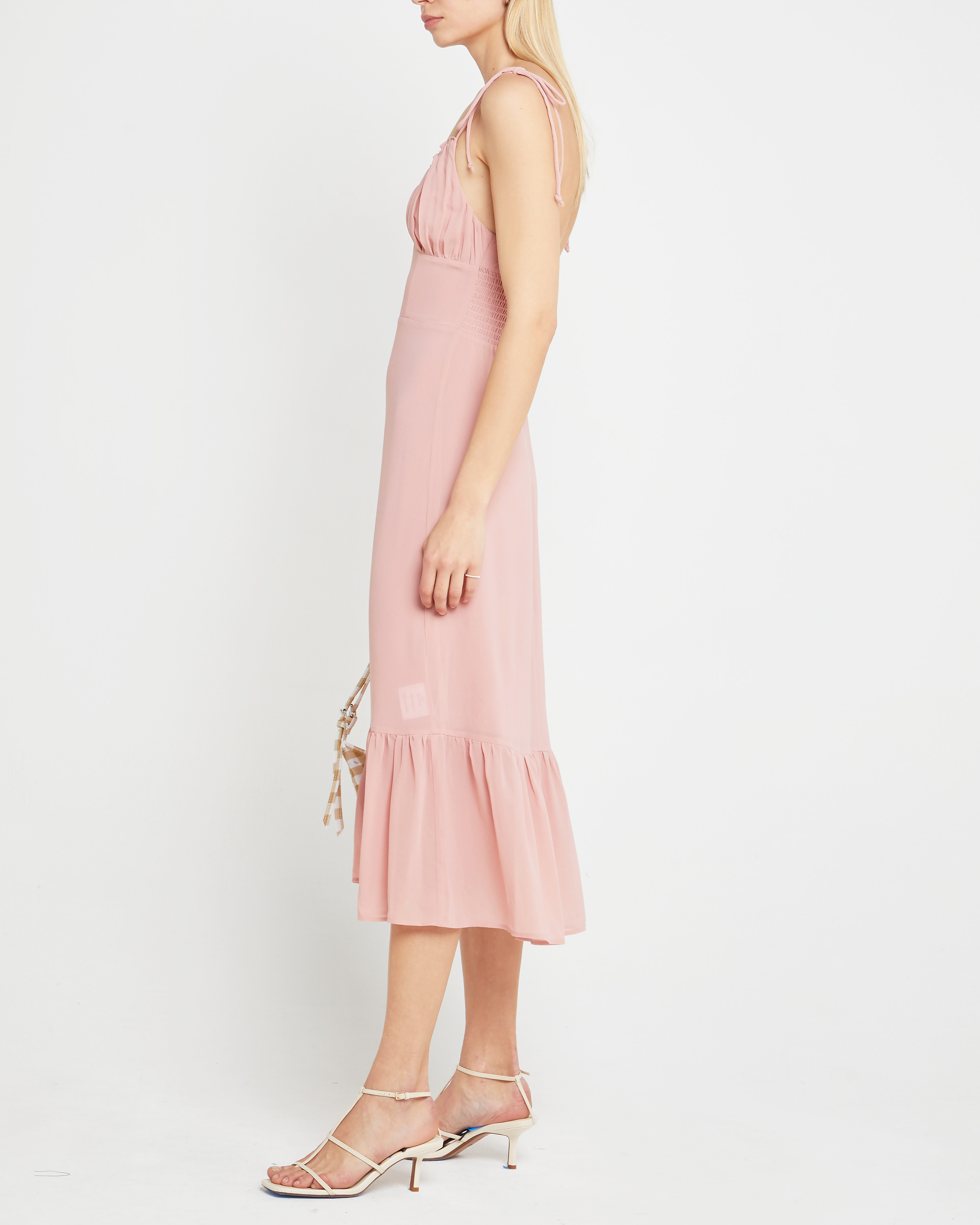 Decked in delicate details, this dress features gathering at the bust and a ruffled hem. Finished with tie straps and done in a breezy chiffon.