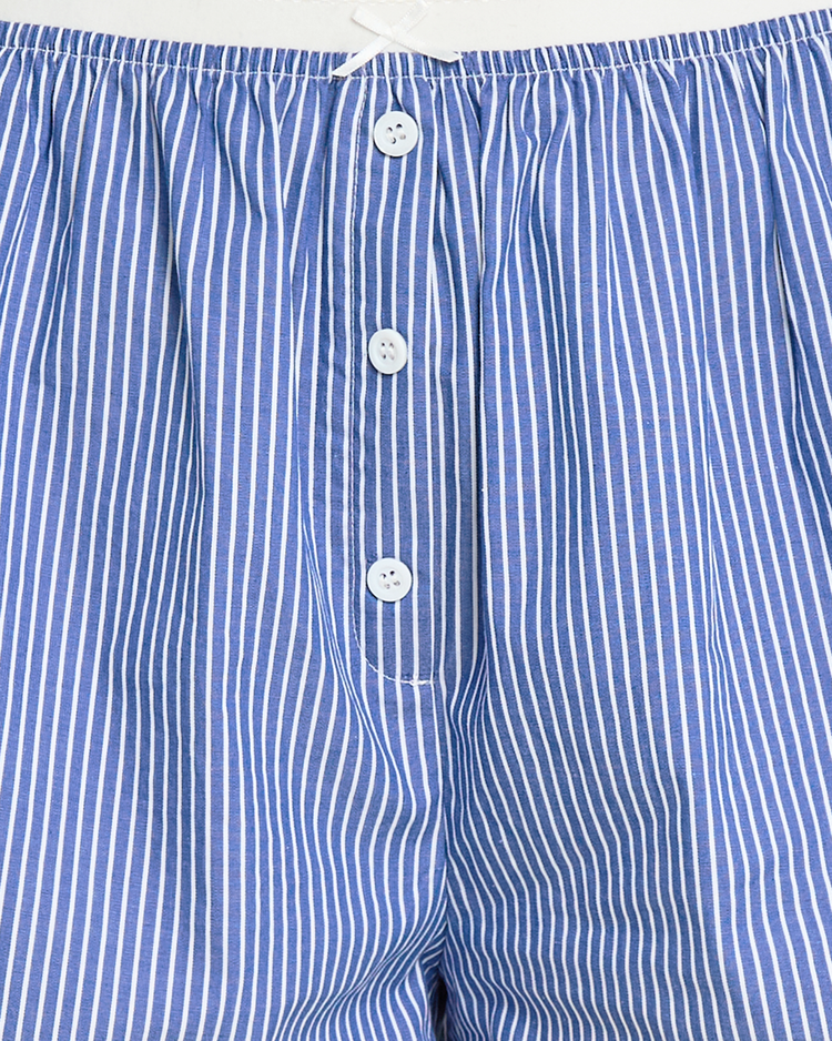 The Kippa Cotton Short boasts a chic pinstripe design, adorned with a dainty bow and lace trim detailing. Its elastic waist ensures a comfortable fit, paired with button accents for added style. Stay cool and stylish with this must-have summer staple.