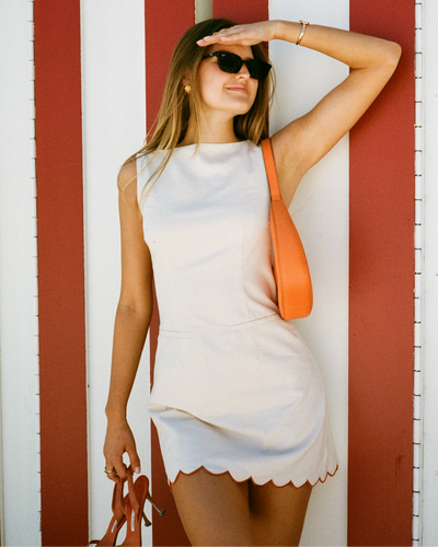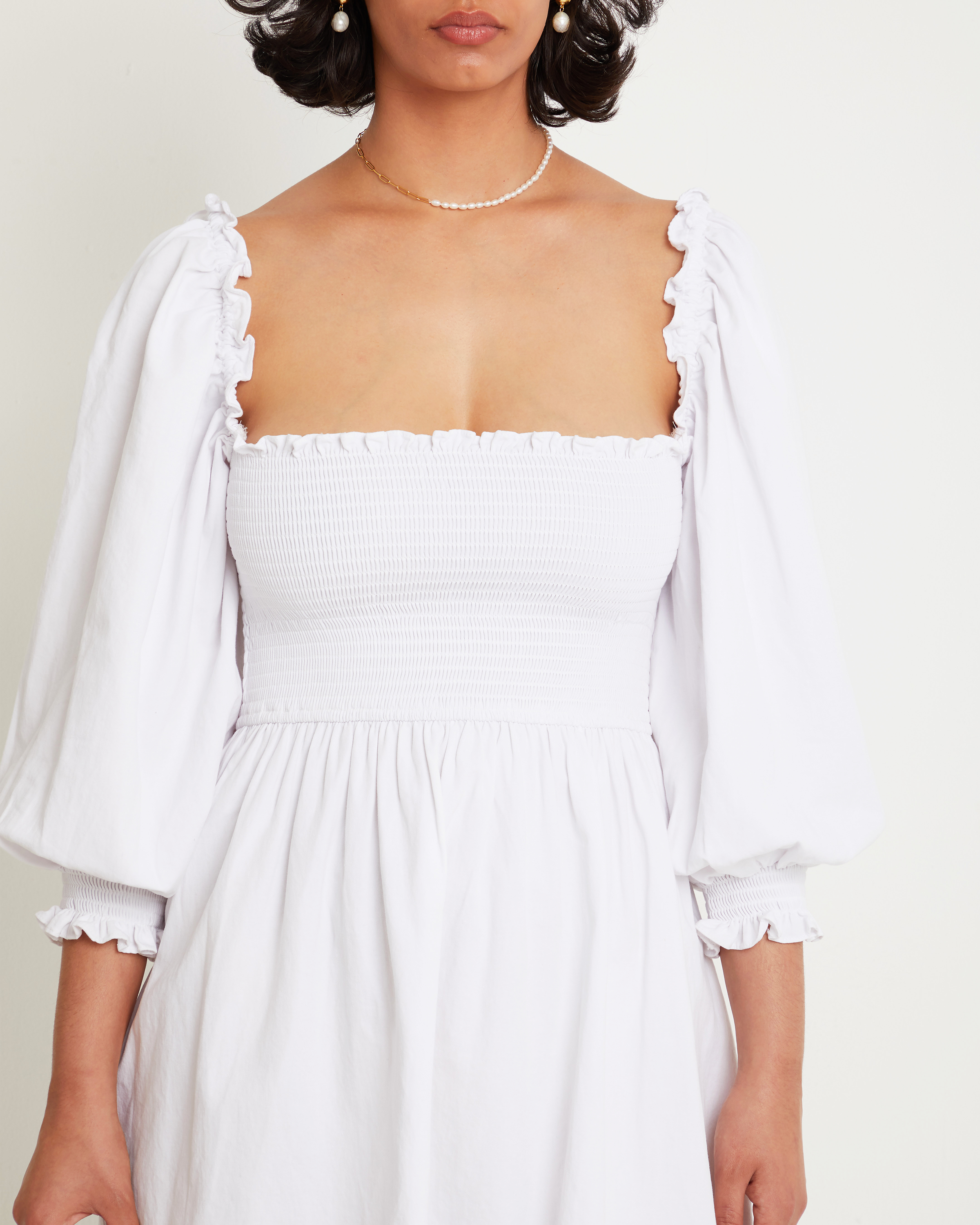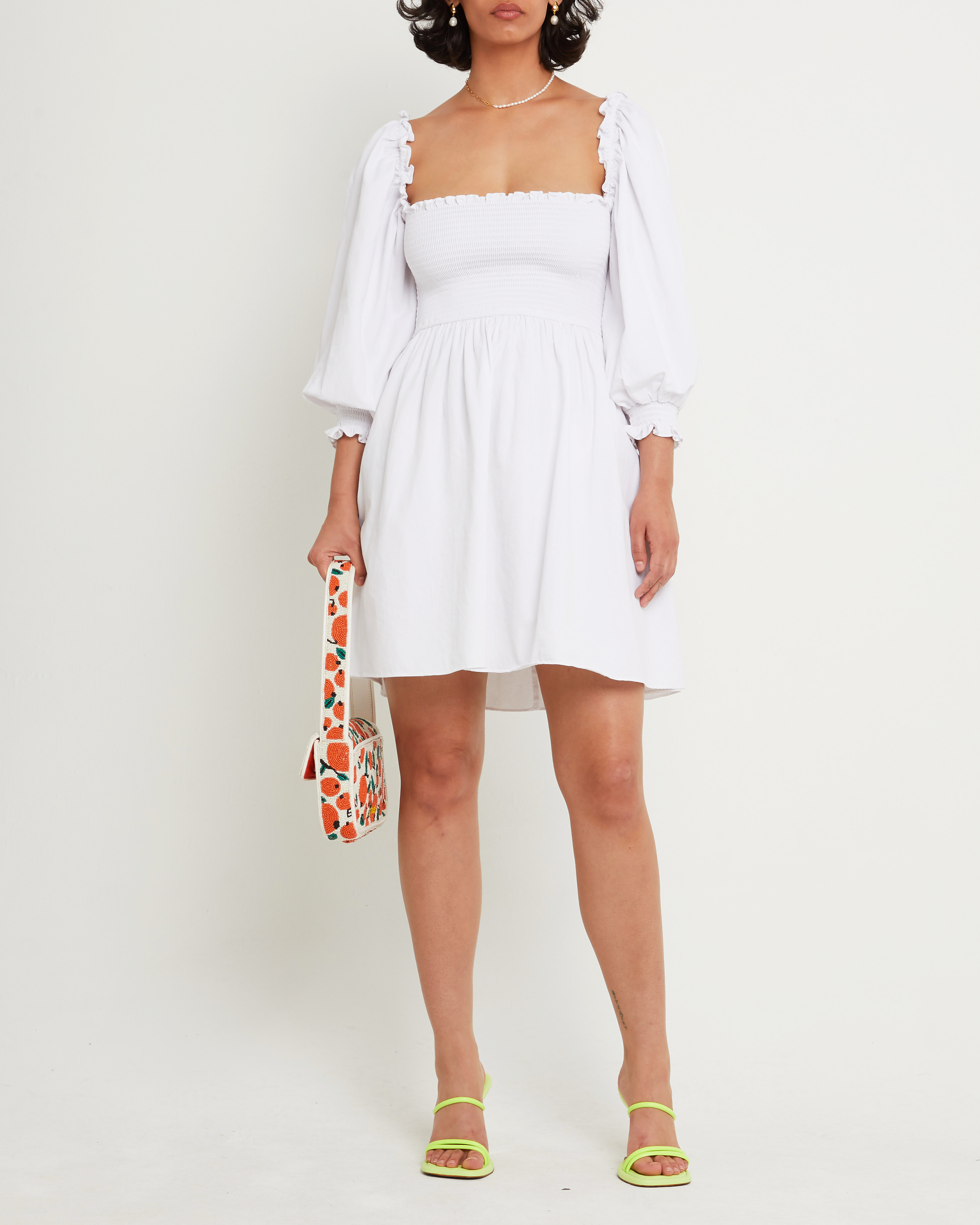 The sweet and simple design of this mini dress features an easy smocked bodice and puff sleeves. Done in a cool, denim-like material.