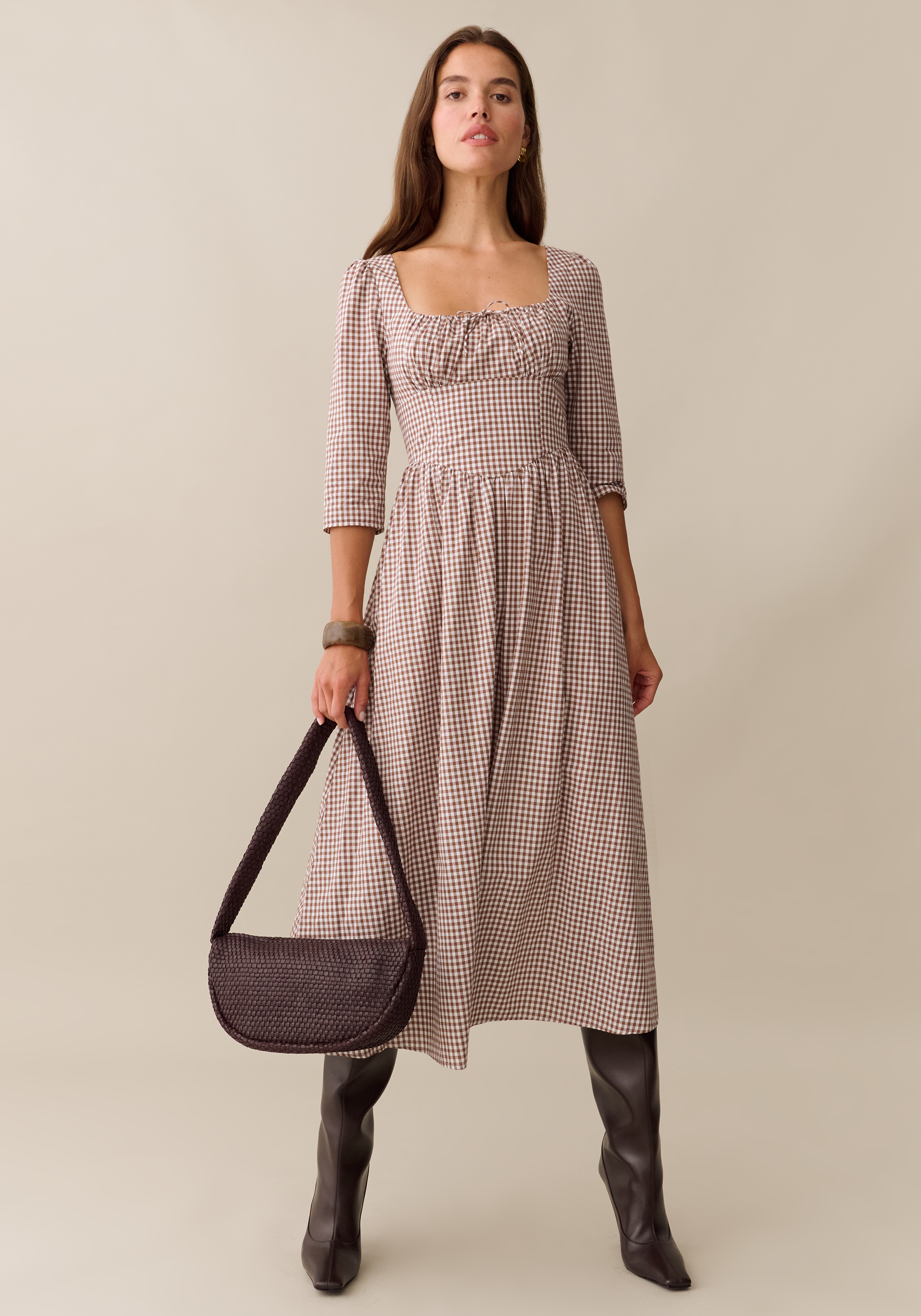 The Lucette Cotton Dress features a charming gingham pattern with 3/4 length sleeves and a fitted bodice that flatters your silhouette. The gathered bust is enhanced by a delicate tie detail, adding a subtle touch of femininity. Designed for everyday wear, this dress combines comfort with timeless style, making it a versatile addition to your wardrobe.