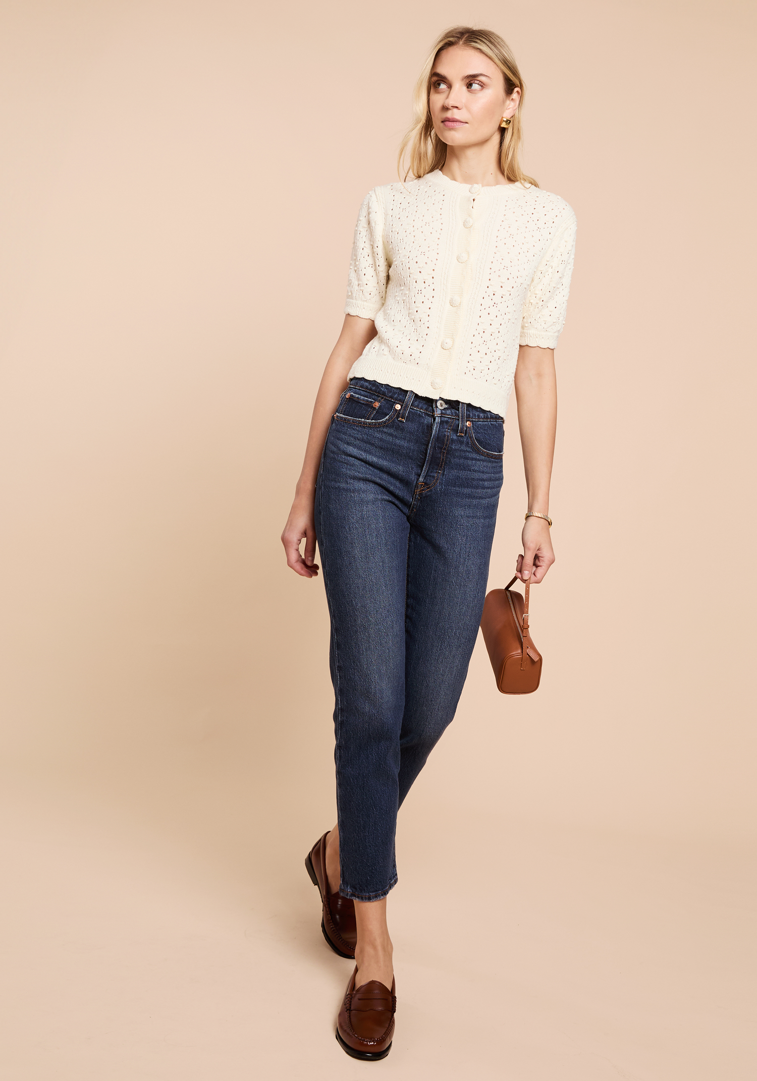 The Marcella Cardigan is crafted from an adorable textured cream knit, featuring short sleeves and knit-covered buttons. Its relaxed fit offers effortless comfort and versatility, making it an easy layering piece.