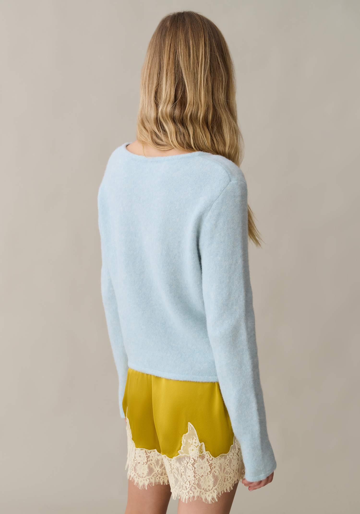 The Marielle Cardigan features a sweet, soft hue that adds a subtle yet stylish touch to any outfit. Crafted for cozy comfort, it is detailed with matching buttons that elevate its classic cardigan design.