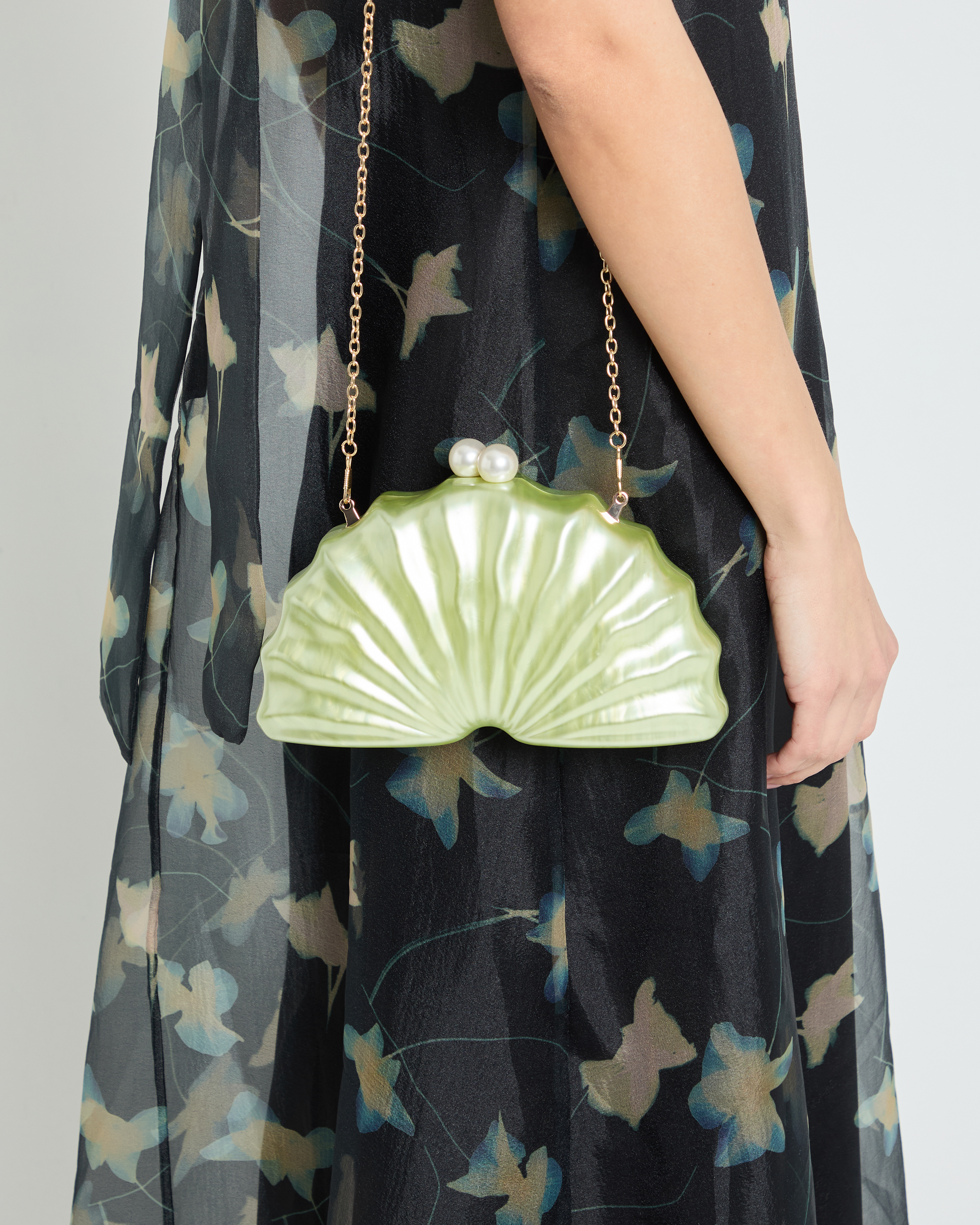 The Maris Shell Acrylic Clutch boasts a luminescent, sculptural design inspired by the unique shape of a seashell. Perfect for special occasions, this clutch adds an elegant touch to any outfit.