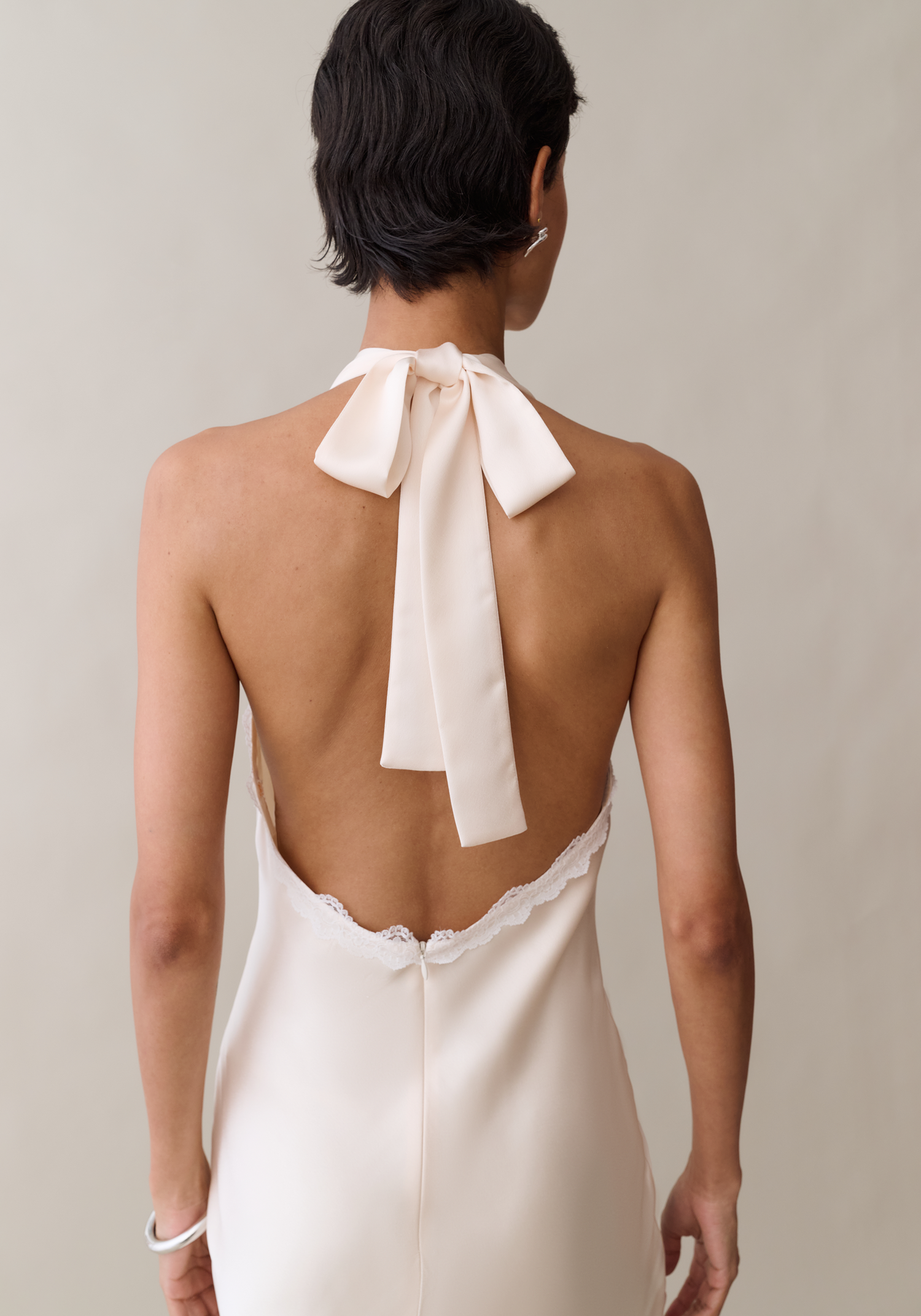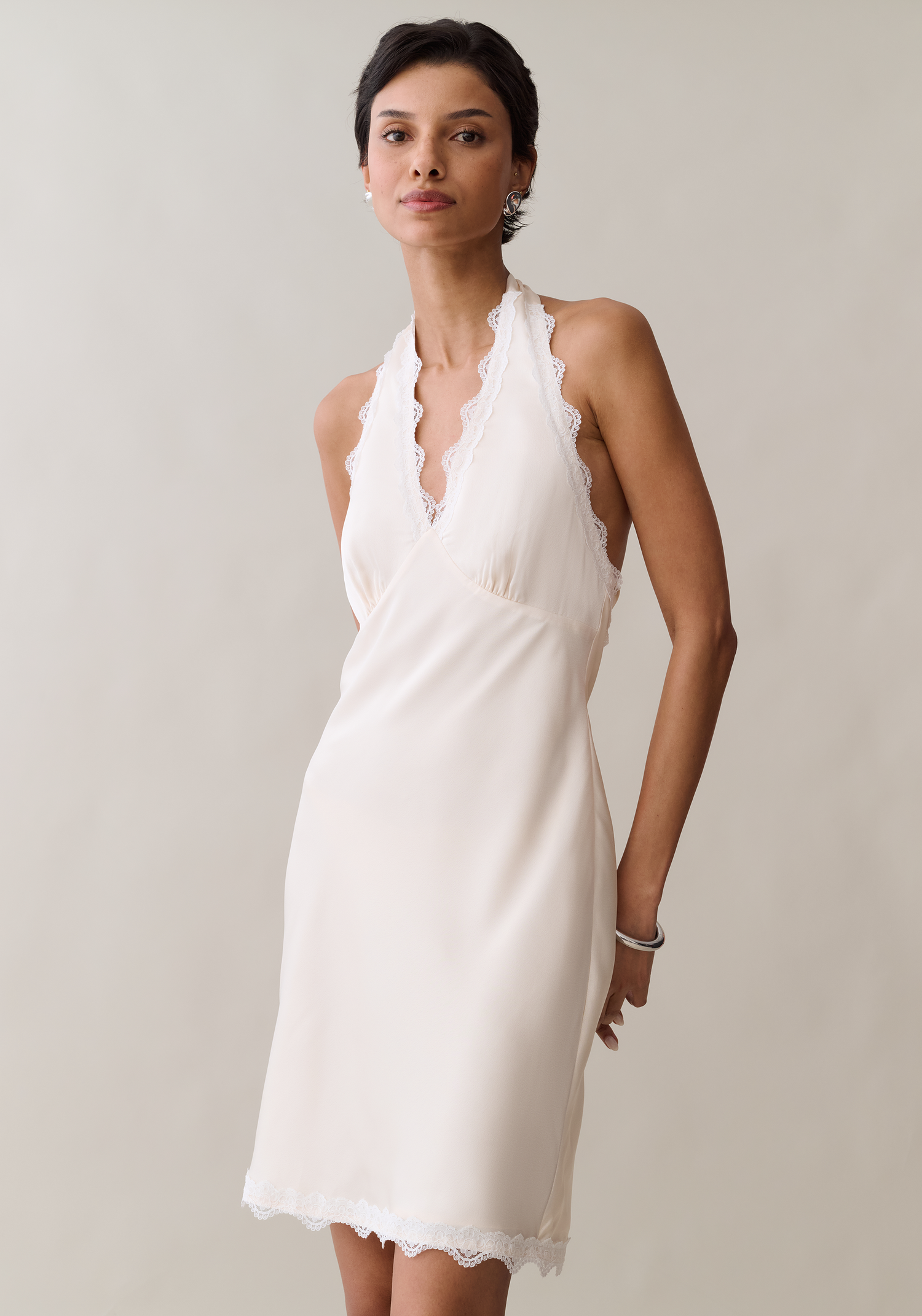 Embrace vintage-inspired romance with this effortless ivory slip dress. Crafted from a smooth, silky fabric that beautifully skims the figure, it features a flattering halter V-neckline framed by delicate lace trim.